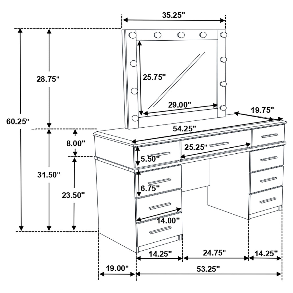 Brighten your dressing space with this contemporary vanity table and mirror set. Finished in a white high gloss for a sleek, polished effect, it features nine spacious drawers lined with felt to keep cosmetics, jewelry, and accessories neatly organized. Smooth metal extension glides ensure easy access, while chrome bar pulls add modern appeal. Topping the vanity is a beveled mirror outlined with eleven Hollywood-style LED lights, offering brilliant illumination for flawless makeup application and styling. Key Features: • Vanity set in glossy white finish with sleek contemporary design aesthetic • Nine drawers lined with felt provide organized storage for beauty essentials • Smooth metal extension glides ensure stability and effortless drawer use • Beveled mirror framed by eleven Hollywood-style LED lights for brilliance • Chrome bar pull hardware adds a clean minimalist touch to each drawer front • Crafted with rubberwood, engineered wood, and okume veneer