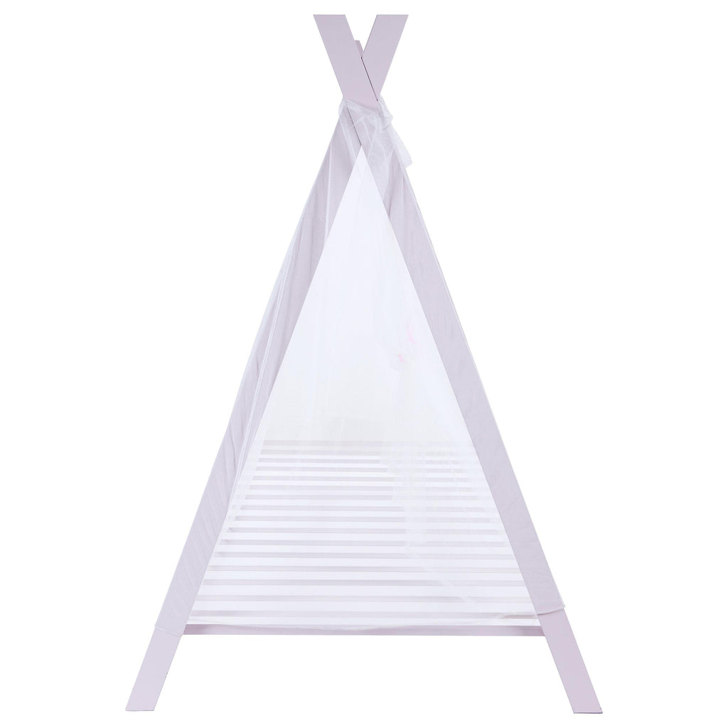 This twin-size tent bed brings a playful touch to any bedroom while offering practical comfort. Crafted from heavy-gauge metal with a powder-coated pink finish, the frame features a charming tent-style design. The included sheer fabric canopy drapes over the structure, creating a cozy retreat. Its platform base supports a mattress without the need for a box spring, ensuring a low-profile look while maintaining sturdy support.