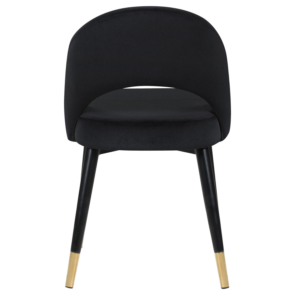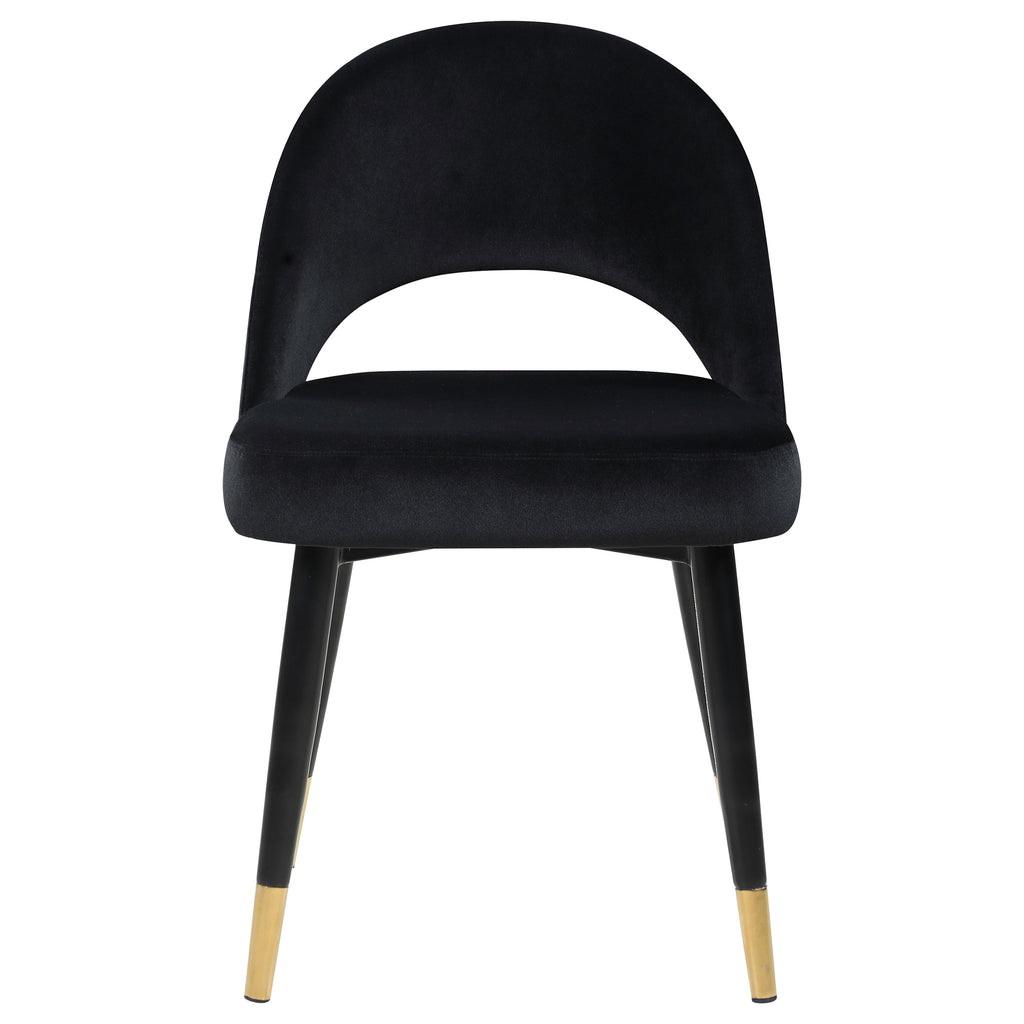 Add a touch of retro-inspired elegance to your dining room with this stylish dining side chair, featuring an elegant bucket-style seat that embodies Mid-Century modern charm. Wrapped in luxurious velvet, each chair provides a supportive, long-lasting seating experience, making it perfect for hosting dinner guests or enjoying a cozy meal. The flared, tapered legs, finished with dramatic gold-capped feet, add a regal Hollywood glam touch that enhances any dining space. This versatile chair effortlessly complements various color palettes and brings a bold statement to both formal and casual settings. Pull these chairs up to a spacious rectangular dining table to create an inviting and chic atmosphere for any gathering. _x005F_x000D_ Key Features: • Retro-inspired dining side chair with a sophisticated bucket-style seat • Velvet fabric upholstery offers a bold statement and complements diverse color palettes • Flared, tapered legs with gold-capped feet add a Hollywood glam touch • Supportive, long-lasting seat ideal for dinner guests and cozy meals • Perfect for Mid-Century modern, contemporary, and Hollywood glam decor styles • Ideal for dining rooms, cocktail nights, or as a stylish accent in any space