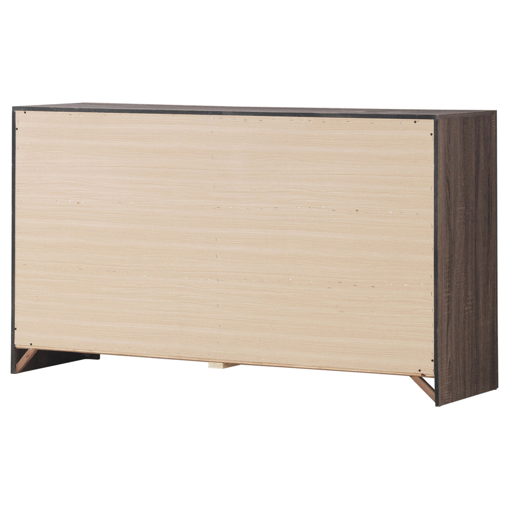 This six-drawer dresser offers a perfect balance of style and storage. Its clean-lined frame complements modern and contemporary spaces, while six spacious drawers provide ample room for clothing and accessories. Crafted from engineered wood with a durable laminate veneer, this dresser is built for everyday use. Matte dark bronze handles add a refined contrast, enhancing its sleek and functional design. Key Features: • Six-drawer dresser with a sleek and modern silhouette • Barrel oak finish enhances the natural wood grain-inspired look • Spacious drawers provide ample storage for clothing and essentials • Sturdy engineered wood construction ensures lasting durability • Matte dark bronze handles contrast beautifully with the finish • Durable laminate veneer resists scratches, stains, and wear