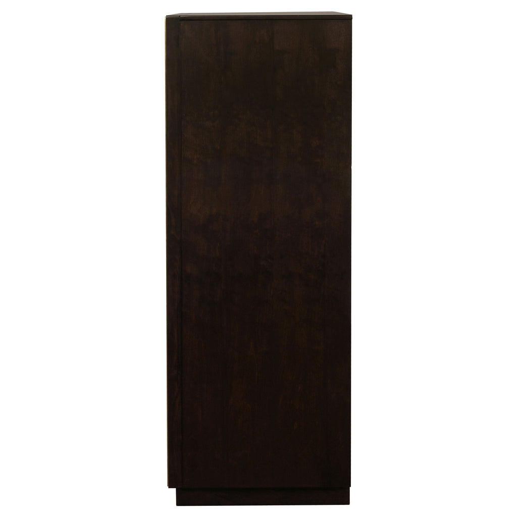 With five spacious drawers, this chest is convenient and versatile. Its large size is ideal for keeping your wardrobe organized. Its strong silhouette is enhanced by an attractive, smoked peppercorn finish. Its long, sleek drawer handles and outer frame are a lovely shade of gold, giving it an eye-catching touch of glamour. With a transitional design, this chest blends seamlessly with a variety of decor styles. Key Features: • Large, five-drawer chest ideal for wardrobe organization • Features a strong silhouette enhanced by a smoked peppercorn finish • Accented with long, sleek gold drawer handles and outer frame for a touch of glamour • Boasts a transitional design that blends seamlessly with various decor styles • Offers convenience and versatility with its spacious storage capacity