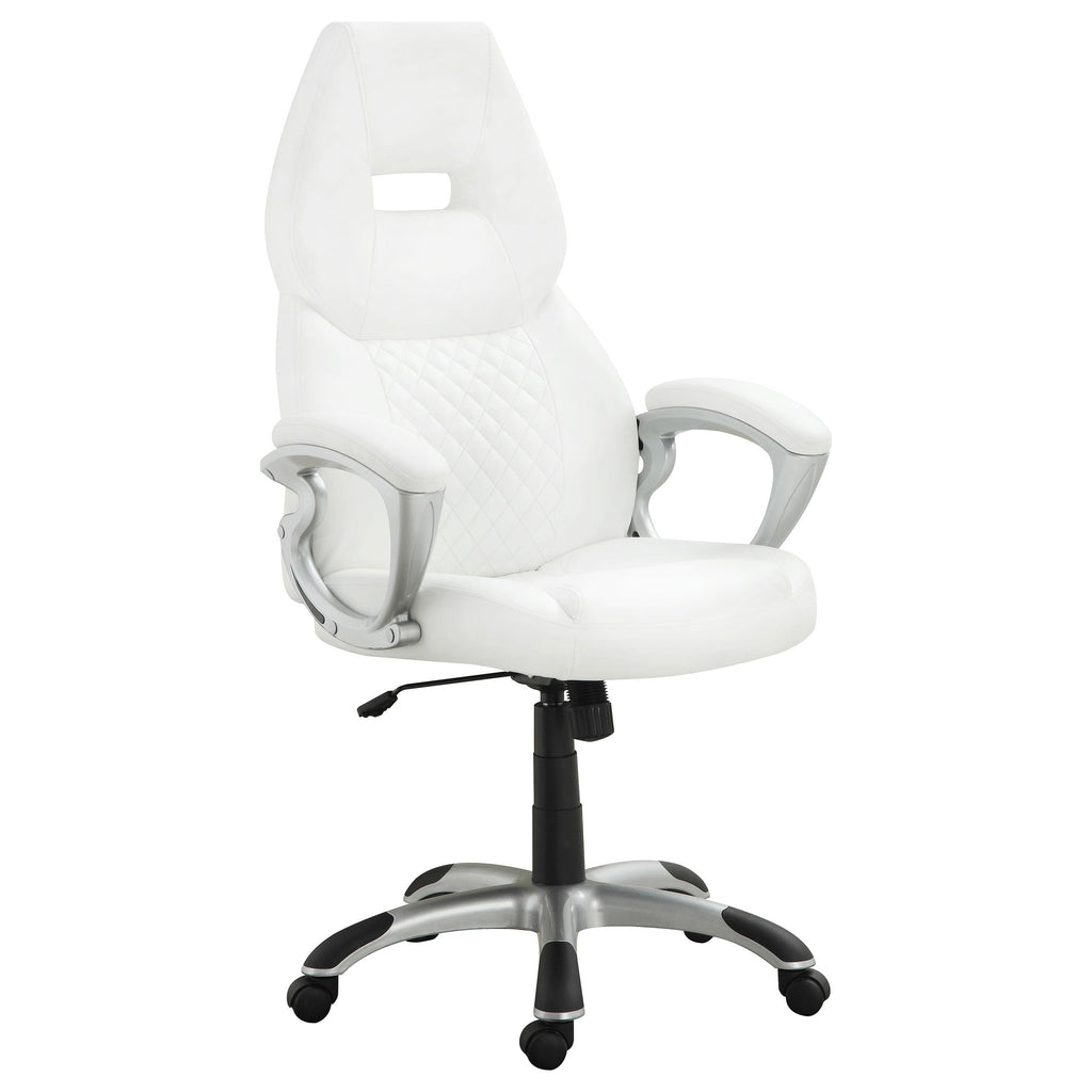 A modern office enjoys a light, airy uplift with this office chair. Contemporary design elements fashion a sleek, sophisticated look. Upholstered in white leatherette, it offers easy care and an energetic attitude. Enjoy ergonomic comfort with a large headrest, contoured back, arm rests, and a slender molded seat. Adjustable height settings provide tailored positions, and a caster wheel base ensures smooth portability.