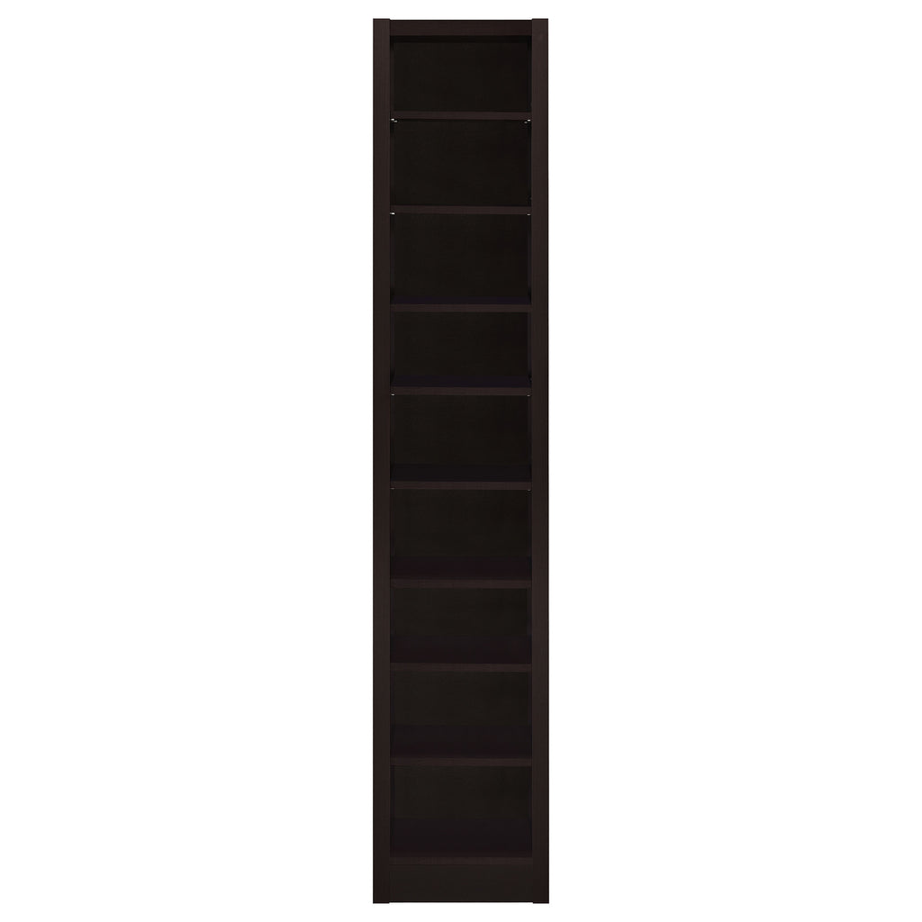 Maximize storage without sacrificing style with this tall, narrow bookcase in a deep cappuccino finish. Designed with a compact footprint, it features nine shelves—six of which are adjustable—to easily accommodate books, décor, or office supplies. Crafted from engineered wood and finished in a durable melamine veneer, this sleek bookcase adds a modern touch to any living room, bedroom, or home office.