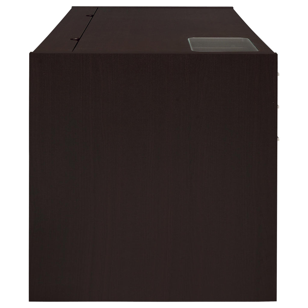 A modular design scheme adds function and personality to a modern task space. This connect-it computer desk conquers basic operations and lends a stylish contemporary look. Finished in bold cappuccino, its linear silver hardware pulls offer a cool touch. Find storage space in three side drawers with Euro glides and a center keyboard drawer that makes computing a snap. Spruce up a compact contemporary office or home space with this exceptional desk. Key Features: • Connect-It office desk in cappuccino finish • Lift-top cord management compartment, a keyboard tray, two (2) storage drawers, and one (1) file cabinet are features of this desk • Clear tempered glass insert on desk offers clear view of devices • Lift-top storage contains power outlet (4AC) • MDF, particle board, and laminate construction