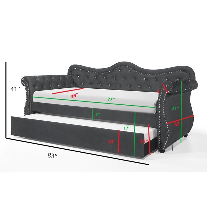 This undeniably eye-catching Abby Day Bed with Trundle offers not only luxurious flair, but also plenty of function. With curved armrests, this day bed offers a comfortable spot to lounge. This Navy Blue velvet-upholstered daybed is accented with crystal tufts and nailhead application built over a solid wood frame. Box spring is not required.