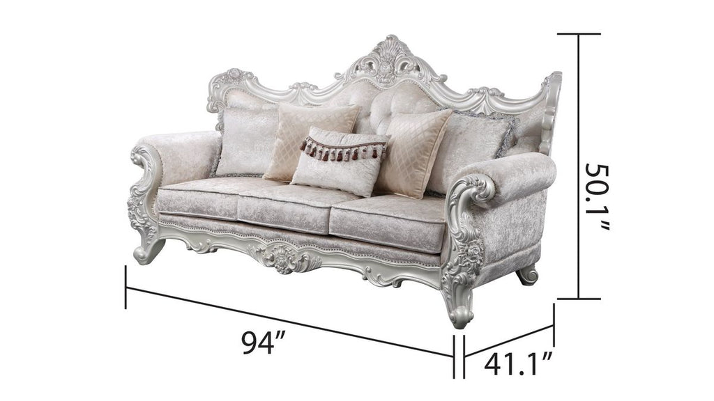 Immerse yourself in a realm of elegance and comfort with this meticulously crafted sofa. The durable manufactured wood construction is enveloped in a champagne shade, accented with a delicate silver brush finish, exuding a traditional charm that elevates any living space. Accompanied by a set of five plush pillows, it promises not only aesthetic appeal but also an indulgent seating experience for you and your guests.