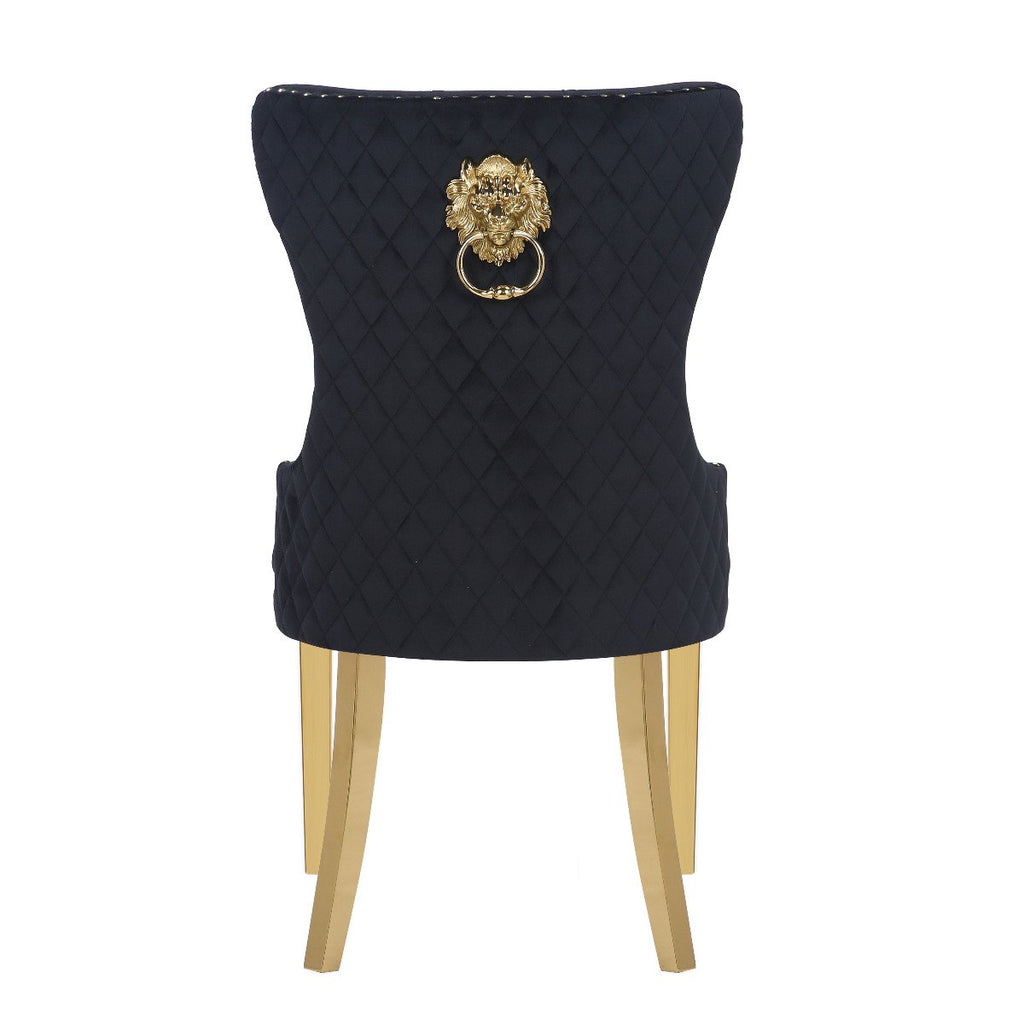 Sit down in comfort to eat with the stylish Simba velvet - Upholstered dining chairs providing the perfect feel and atmosphere complete with a sophisticated tufted finish with gold legs. The back is quilted to give a luxurious look. It has a golden lion head accent ring in the back. The Nailhead application on the chair adds to the beauty of the chair.