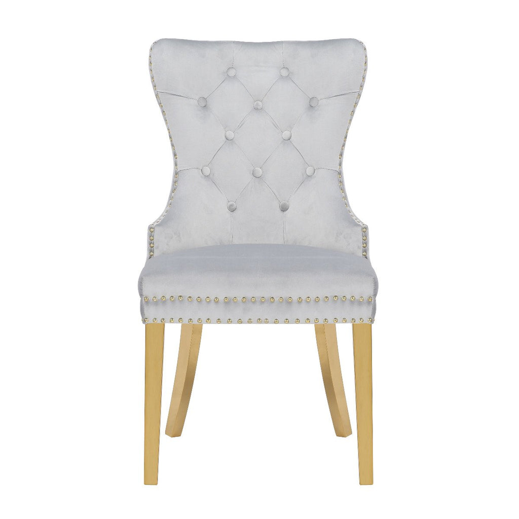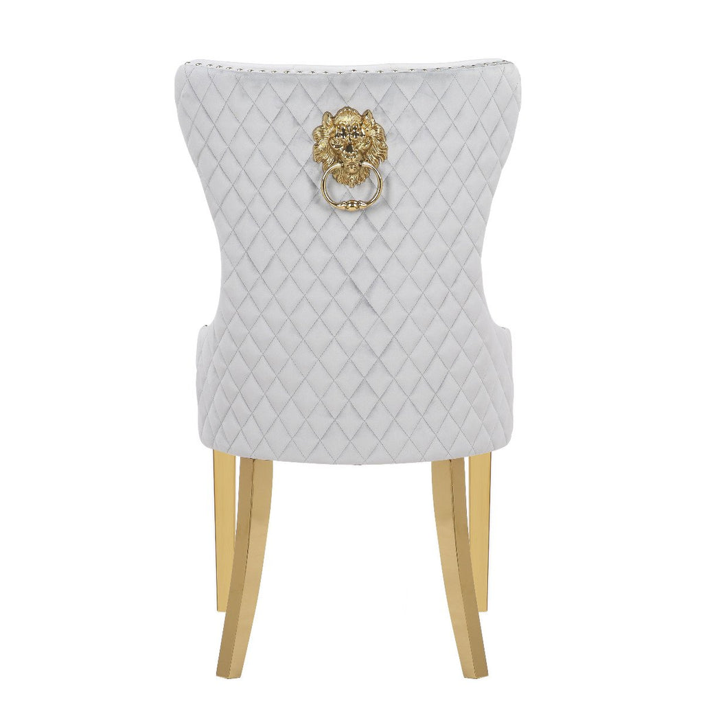 Sit down in comfort to eat with the stylish Simba velvet - Upholstered dining chairs providing the perfect feel and atmosphere complete with a sophisticated tufted finish with gold legs. The back is quilted to give a luxurious look. It has a golden lion head accent ring in the back. The Nailhead application on the chair adds to the beauty of the chair.