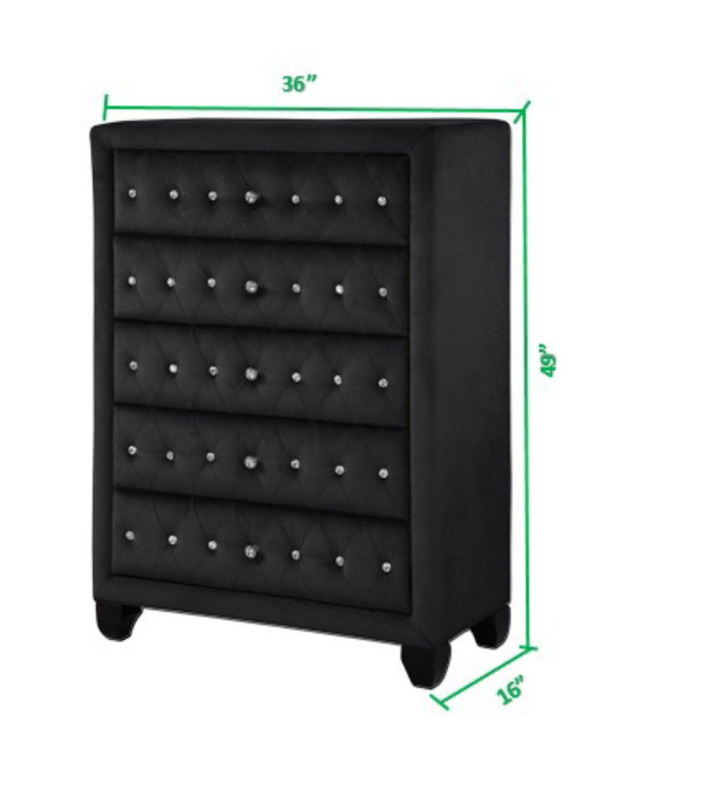 Enhance your bedroom organization with the 5-Drawer Chest. Featuring five spacious drawers with crystal accents, this chest offers both style and utility. Its modern design and wood construction ensure it's a lasting addition to your bedroom. Five roomy drawers for organized clothing storage. Crystal accents on drawer knobs for a chic look. Modern and functional addition to your bedroom. Made from wood to withstand daily use.