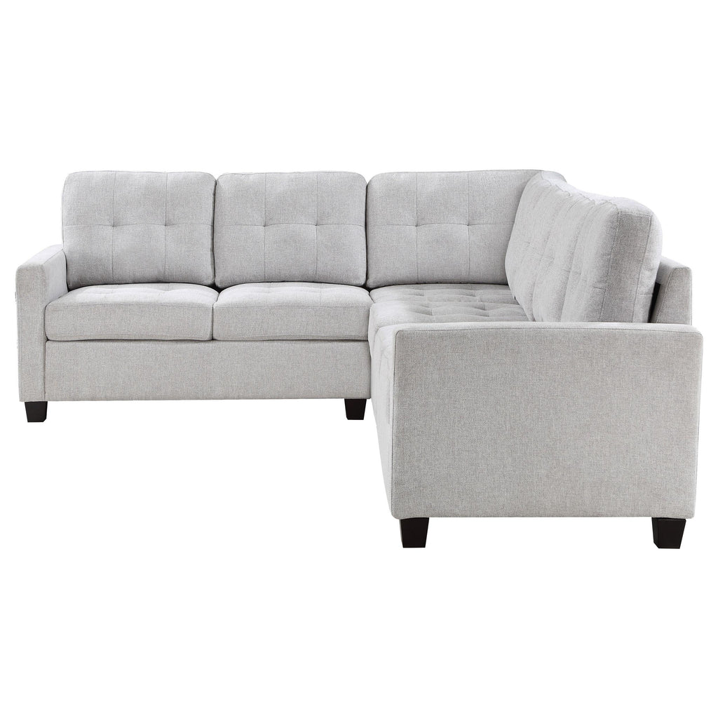 Ensure stylish seating for the whole family with a modern L-shaped sectional sofa. In beige for a warm, neutral presence, the sofa boasts tufted cushions and accent pillows that crate depth and dimension in an inviting living room. Back cushions are reversible for added versatility, while seat cushions are attached to ensure they stay in place when lounging or entertaining. Track arms establish a structured, simple silhouette, perfect for a wide variety of spaces and surrounding decor. Block feet taper to add the perfect finishing touch.