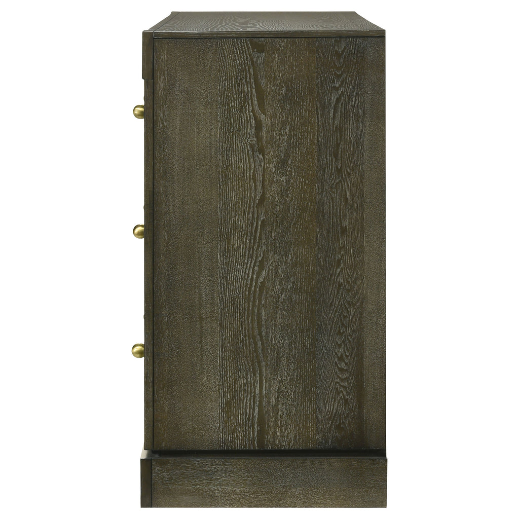 Add a touch of elegance to your bedroom with this spacious dresser, featuring a transitional design with rounded corners and trending details. The dark cocoa finish and brass knobs complement the sophisticated style, while the solid wood drawer box with English dovetail joinery ensures durability. The dresser includes felt-lined top drawers and 45mm metal ball-bearing glides for smooth functionality. Crafted from solid hardwood, ash veneer, and MDF, this dresser combines style and practicality. Key Features: • Spacious 6-drawer dresser with transitional design • Dark cocoa finish with brass knobs • Solid wood drawer box with English dovetail joinery • Felt-lined top drawers for added elegance • Crafted from solid hardwood, ash veneer, and MDF