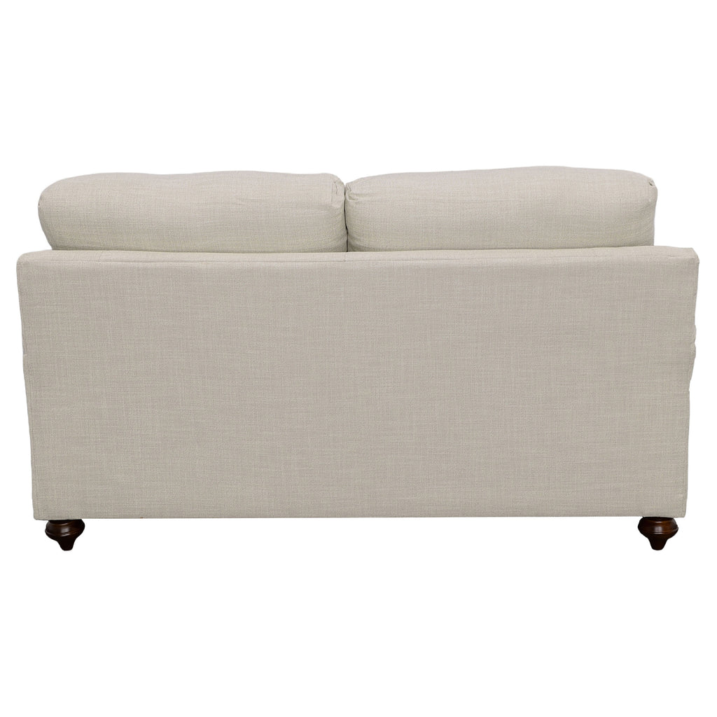 Take advantage of charming farmhouse influence that steers the design of this stylish loveseat. With tailored English arms and turned legs offering a contrasting espresso finish, this loveseat shines with a light grey linen-like upholstered cover. Two reversible cushions T-cushions create comfort and stay in shape, as a solid wood frame with a sinuous spring deck sets the stage for durability. Attached back cushions remain stationary to prevent shifting. Enjoy the designer look of two accent pillows with a houndstooth patterned cover. Key Features: • Bring LOVE to your living area with this sophisticated farmhouse collection • Tailored English arms • Turned legs in espresso • No rearranging required with easy to maintain attached back cushions • Extend the life of your upholstery set with reversible seat cushions