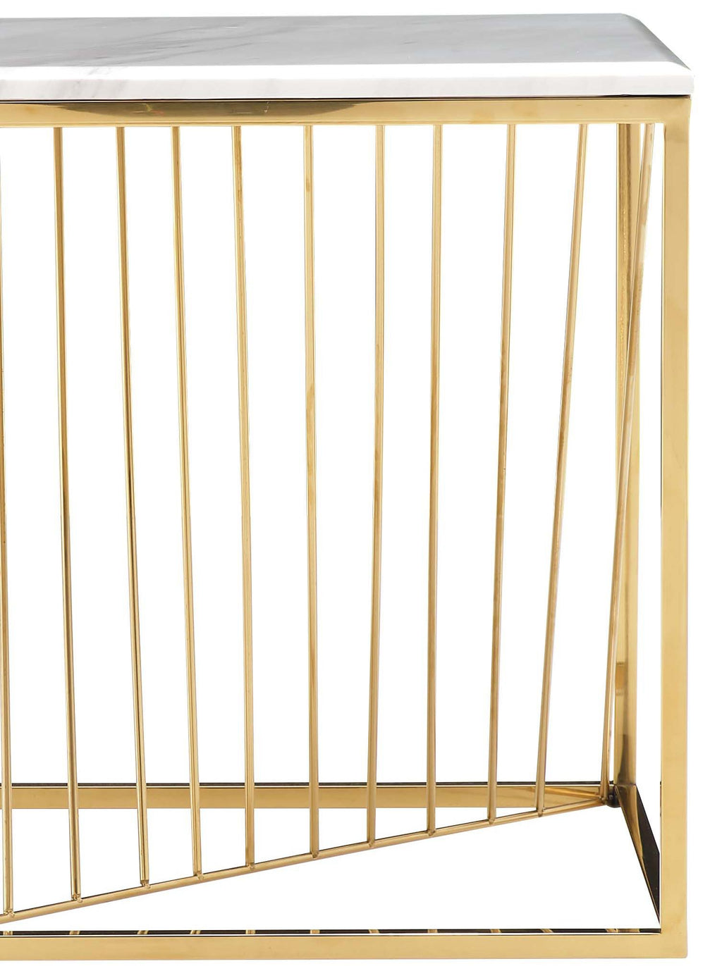 Cosmos Furniture's Halina modern style marble top End Table with metal finish is a unique geometric base. Three-dimensional, angled accent table with a lustrous gold overlay. Beautiful and sophisticated, this table is the perfect choice for a contemporary setting. It features a white faux marble tabletop which is supported on gleaming gold geometric linear metal base offers a hint of glamour and modern styling. This elegant table will surely add a spark of life to any home decor. Matching Console Table and an Coffee Table is sold separately.