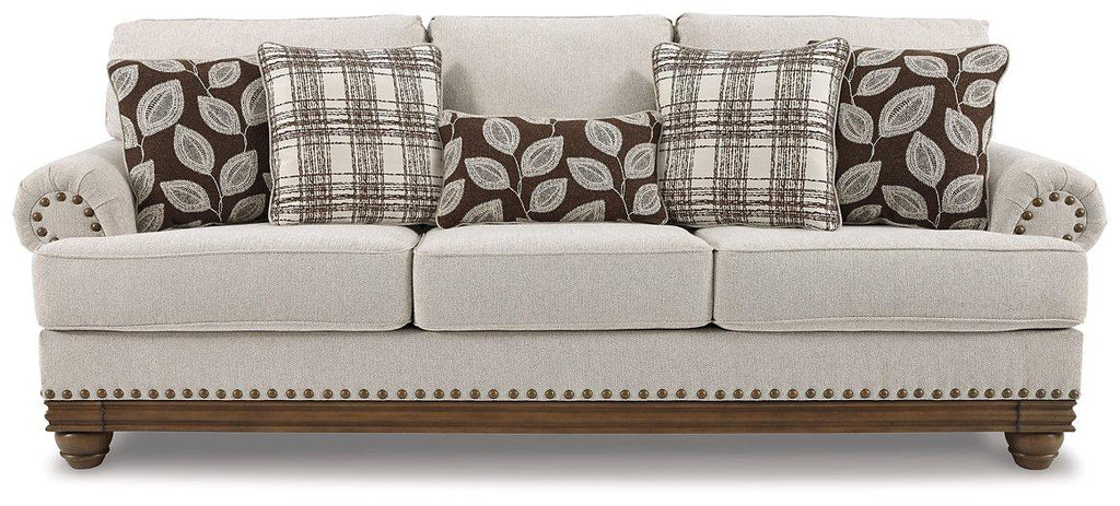 True classic character comes to life in this sofa. Set back pleated rolled arms and warm brown exposed frame with bun feet are beautifully traditional. Lovely detailing carries itself through the herringbone weave in the soft upholstery. Seat cushions reverse to maintain durable comfort. Vintage-inspired jumbo nailhead trim graces the design. Plaid and botanical pillows in dark brown are a timeless touch.
