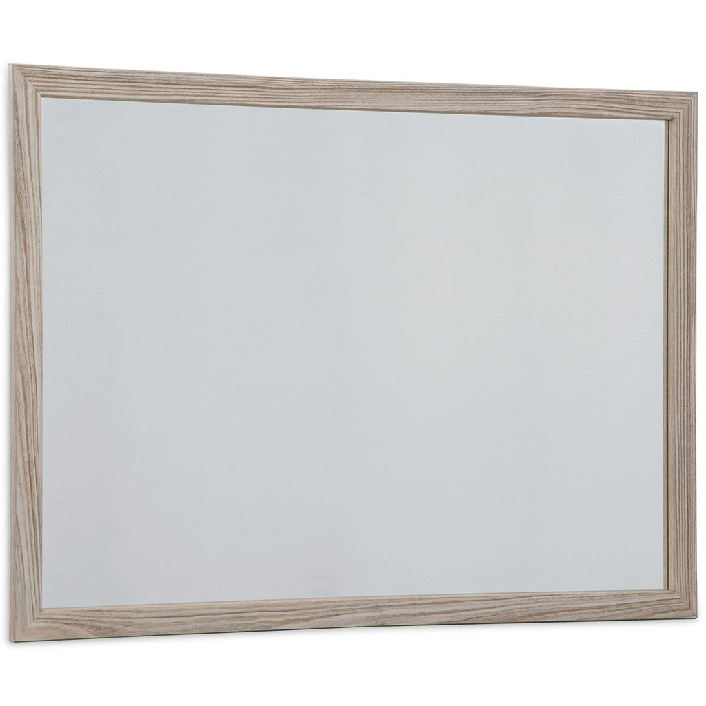 Modern meets neutral and sophisticated in this dresser with mirror. Its natural finish, subtle replicated wood grain and clean lines wake up your bedroom with eye-catching appeal. The generous storage space in its smooth-gliding, lined drawers brings function to relaxed refinement. Elongated handles in a champagne tone speak casual simplicity, creating a smart and stylish bedroom retreat.