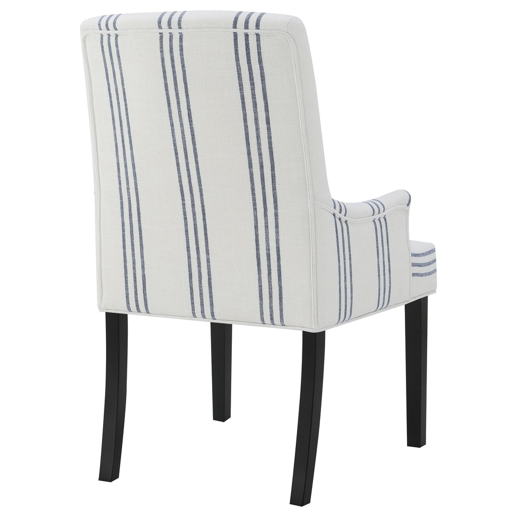 This armchair adds a refined yet relaxed charm to your dining space, blending comfort with casual elegance. Upholstered in linen-like beige fabric with blue stripes, it offers a timeless aesthetic. The padded seat, backrest, and gracefully curved arms ensure both comfort and style. Built with a sturdy rubberwood frame and a sleek black finish, this armchair provides lasting durability. Its versatile design works beautifully in transitional, modern, or farmhouse-inspired interiors. Key Features: • Dining armchair upholstered in beige linen-like fabric with blue stripes for a casual, refined look • Curved arms and padded backrest enhance comfort and add elegant detailing • Sturdy rubberwood frame with a sleek black finish ensures long-lasting durability • Foam-padded construction offers superior support for extended seating • Fabric made from 100% polyester for easy care and maintenance • Perfect for dining spaces with transitional, modern, or farmhouse-inspired styles