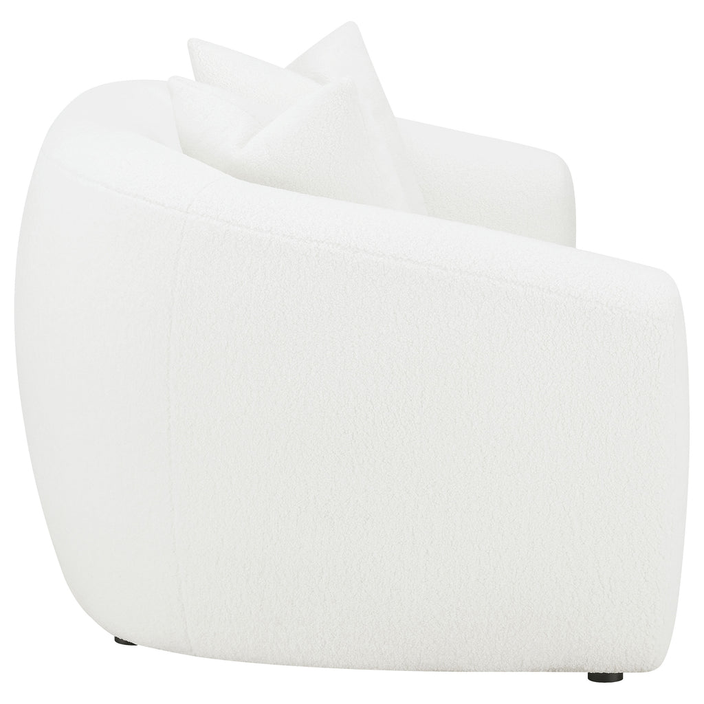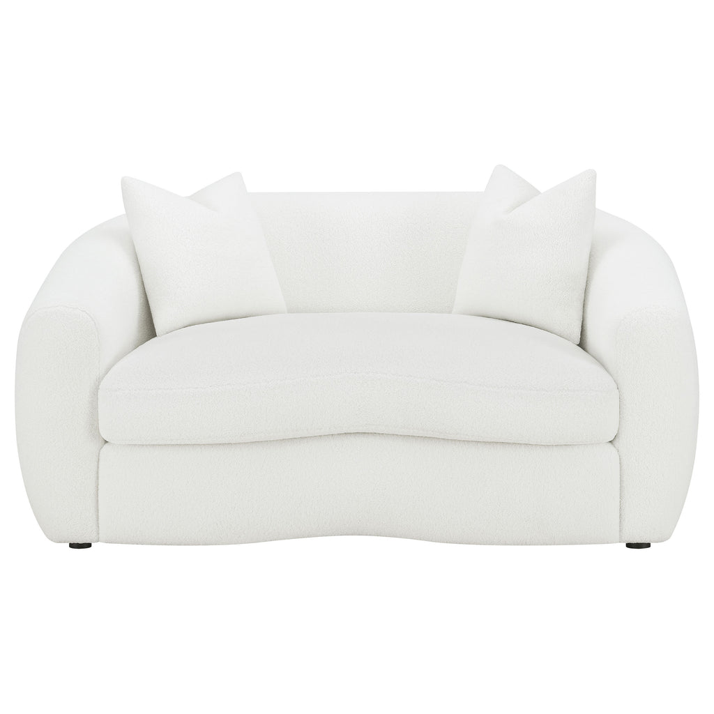 Create your modern entertaining area with this contemporary natural seating set, designed with a boucle fabric across its cloud-like contoured frames, sloped armrests and curved bench seats. Coordinating boucle accent pillows with premium faux down fill offer the finishing touch and extra comfort as contrast bold black legs hidden below elevate each seat ever so slightly.