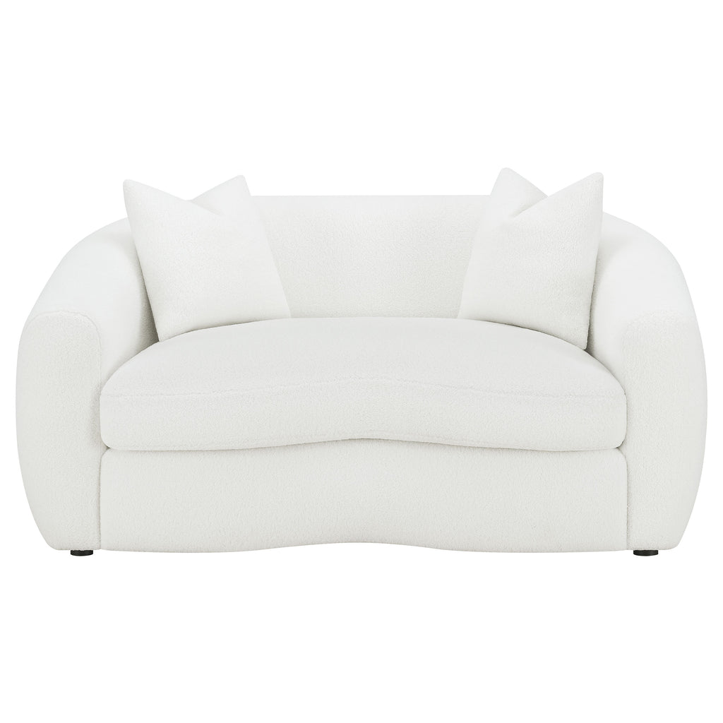 Create your modern entertaining area with this contemporary natural seating set, designed with a boucle fabric across its cloud-like contoured frames, sloped armrests and curved bench seats. Coordinating boucle accent pillows with premium faux down fill offer the finishing touch and extra comfort as contrast bold black legs hidden below elevate each seat ever so slightly.