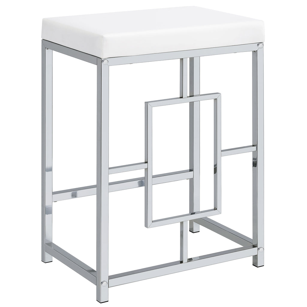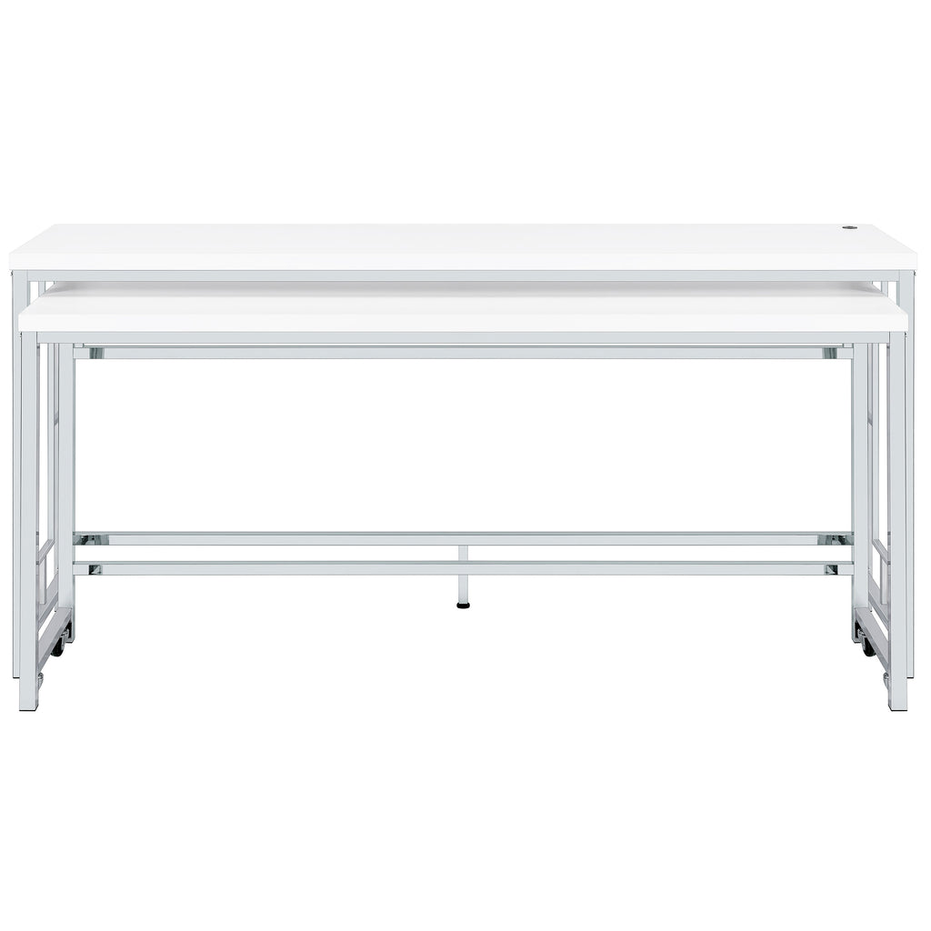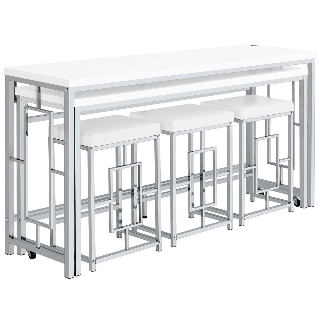 We love this modern five-piece counter height dining set in place of a console behind a floating sofa, offering exceptional versatility and refined style in any setting. It boasts two nesting tables, each long and narrow like a sofa table, but paired with three backless stools that tuck underneath. It's the perfect spot for drinks with friends on game day, or setting yourself up to work from home on a snowy day. The silver and white set features a larger table with wheels on the smaller table to create any configuration that works for you. Stools are decorated with artistic bases with open, floating frames that add Deco flair and white faux leather upholstery over padded seats for optimal comfort.