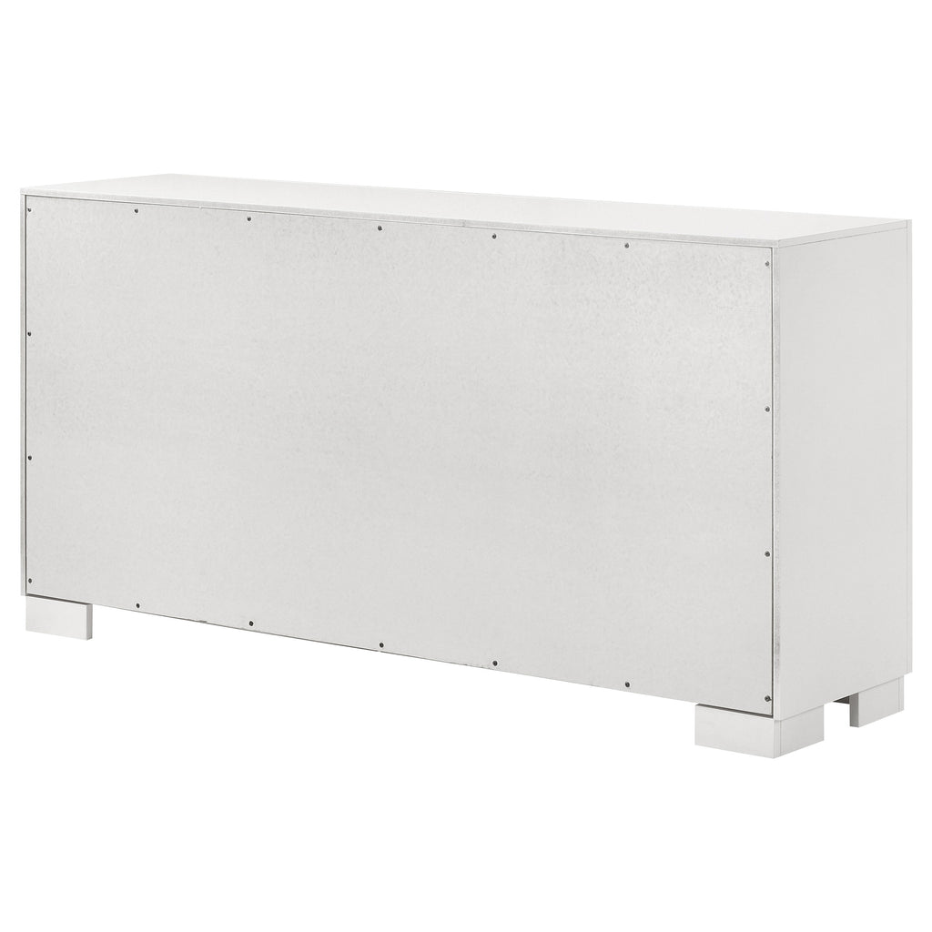 Gracefully proportioned and thoughtfully designed, this six-drawer dresser pairs timeless sophistication with modern simplicity. Smooth-gliding drawers offer generous storage, while felt-lined top drawers cradle delicate keepsakes with care. Sleek bar pulls glimmer softly against the wood’s natural warmth, balancing strength with subtle elegance. Built for lasting beauty and everyday function, this dresser enriches any bedroom with understated allure and enduring style._x005F_x000D_ Key Features: • Cool six-drawer dresser with crisp silhouette and smooth modern form • Bright snow white finish lightens and refreshes bedroom interiors • Felt-lined top drawers keep delicate items protected and organized • Silver-tone bar pulls highlight the dresser’s sleek contemporary look • Durable rubberwood and engineered wood provide strength and stability • Fully assembled design offers ready-to-use convenience and style