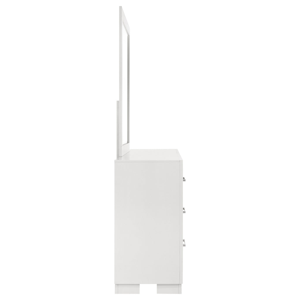 Elegant simplicity defines this dresser and mirror set, offering balance between refined design and everyday function. The six-drawer dresser provides generous storage, while the coordinating beveled mirror brings light and dimension to the room. Sleek bar pulls complement the sturdy wooden construction, creating a harmonious blend of practicality and sophistication. Perfect for modern bedrooms, this pairing completes the space with enduring grace and quiet elegance._x005F_x000D_ Key Features: • Six-drawer dresser and mirror set designed with crisp modern geometry • Snow white finish brightens and refreshes the surrounding space • Coordinating beveled mirror adds dimension and refined contrast • Felt-lined top drawers cradle keepsakes and delicate accessories • Silver-tone bar pulls highlight the sleek and graceful silhouette • Rubberwood and engineered construction ensures lasting durability