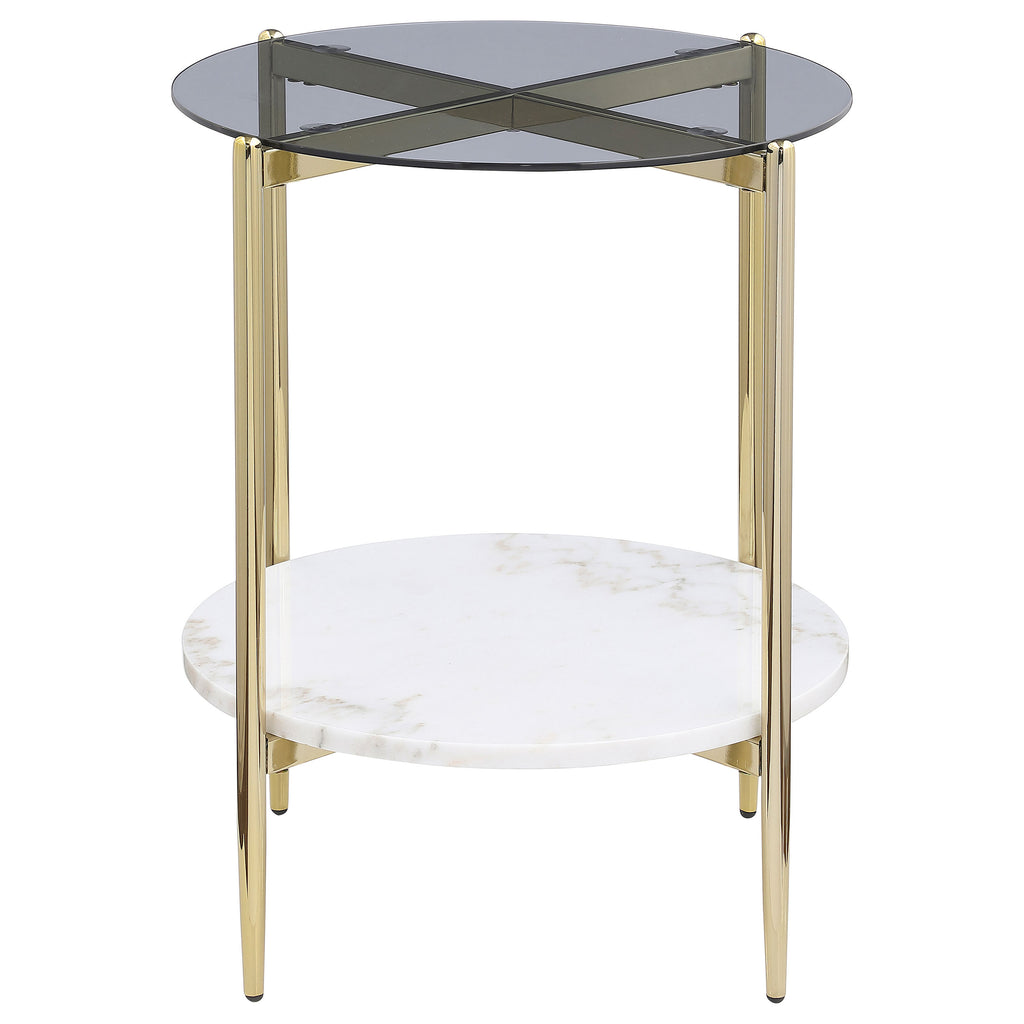 Add a glamorous touch to your living room or entryway with this modern round end table, also perfect as a side table. The gold electroplated chrome frame features slim legs and crossing stretchers, offering a sleek and sophisticated look. The smoke gray tempered glass tabletop creates a chic, contemporary aesthetic. Beneath, the white marble lower shelf provides an elegant space for decor, while leaving the tabletop free for beverages or a tasteful accent like a vase or lamp. Key Features: • Modern end table with a smoked tempered glass top and white marble shelf • Gold electroplated chrome frame with slim legs and stylish crossing stretchers • Smoke gray tempered glass tabletop enhances the table's sleek, modern appeal • Lower shelf crafted from genuine white marble offers an elegant storage option • Gold finish adds a glamorous and sophisticated touch to any room • Perfect as an end table or side table, ideal for living rooms or entryways