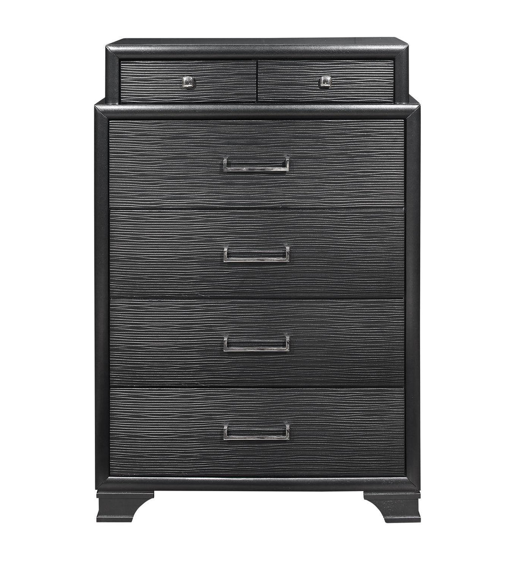 Introducing the Jordyn grey 6 drawer chest by Global Furniture USA, designed with sturdy construction and contemporary styling. Features include 4 large spacious drawers and 2 small spacious drawers. Intricate features include a bar style drawer handles, bracket style feet, and textured drawer fronts which together create this versatile chest fit for any decor style. Choose the Jordyn grey chest to upgrade your bedroom instantly!