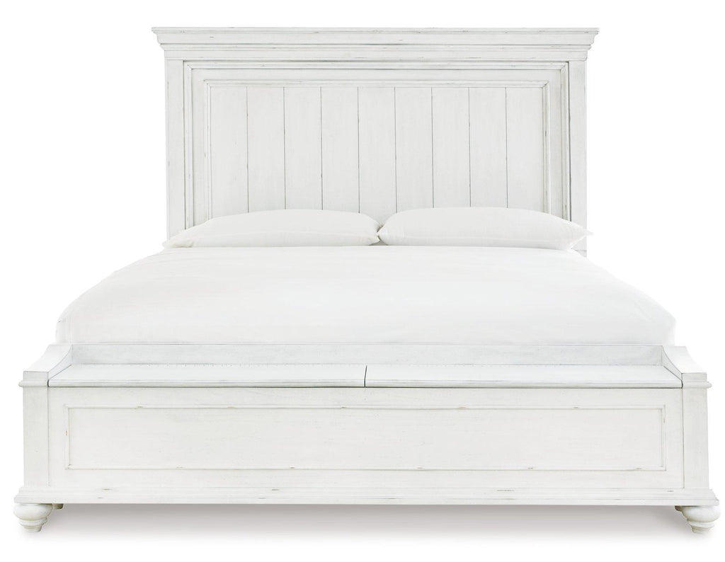 Give your retreat vintage charm with this queen panel bed and storage footboard. In a beautifully distressed whitewash finish, you'll love the headboard's grand style featuring a picture framed panel. The bench footboard is equally elegant offering extra storage and a convenient seat. Generously scaled moulding from top to bottom, along with bun feet give this bed character—evoking the feel of a quaint cottage escape.