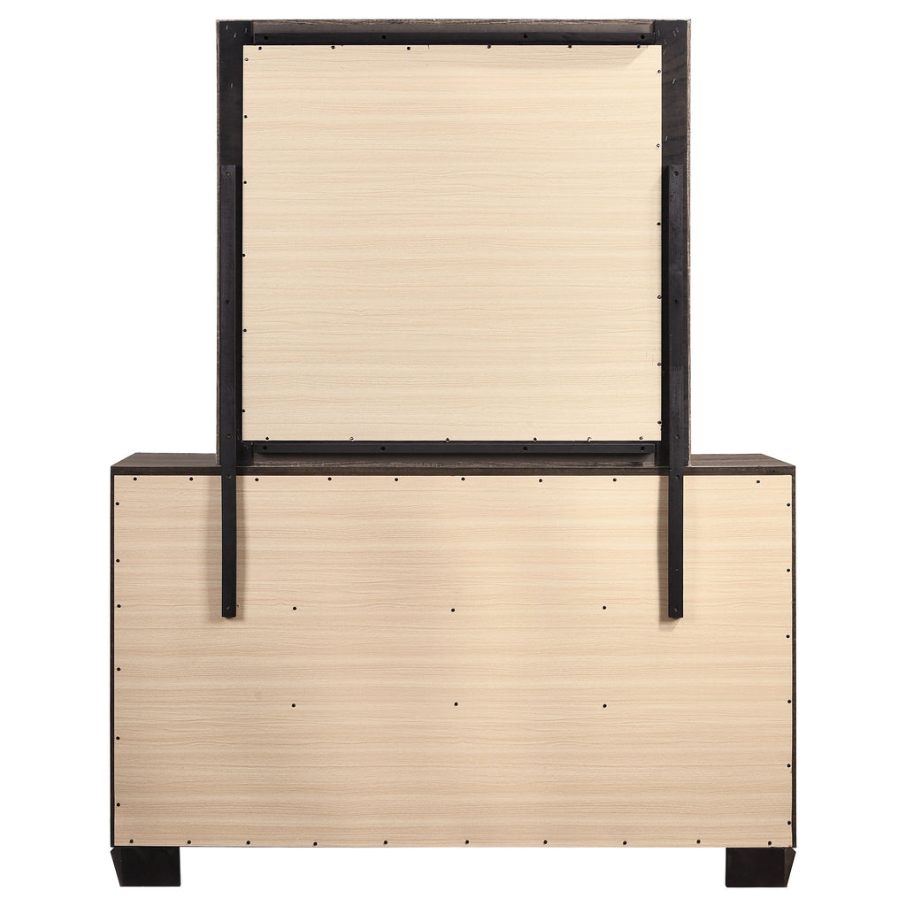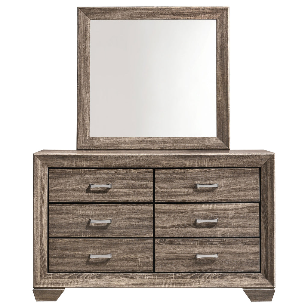 This six-drawer dresser combines stylish lightness and mid-century modern inspiration. The washed taupe finish reveals a stunning exposed wood grain, lending sophisticated charm to the clean lines. Delicately tapered legs and metallic drawer pulls accentuate the refined style, while black recessed grooves around the framed drawer fronts offer a striking contrast. The natural oak's variations are put on full display, ensuring this piece stands out in any bedroom setting. Complementing the dresser, the wood mirror with its elongated lines and minimalist silhouette in a matching washed taupe finish, enhances the space and pairs well with various decor schemes. Key Features: • Six-drawer dresser with mirror featuring clean lines and angular tapered feet • Washed taupe finish emphasizes the exposed grain of the oak-inspired surface • Black recessed grooves outline each drawer front for added contrast and depth • Chrome metal handles offer a sleek accent against the neutral tone frame • Dresser mirror framed in washed taupe with a linear profile and minimalist edge • Crafted from engineered wood with a scratch-resistant laminate veneer wrap