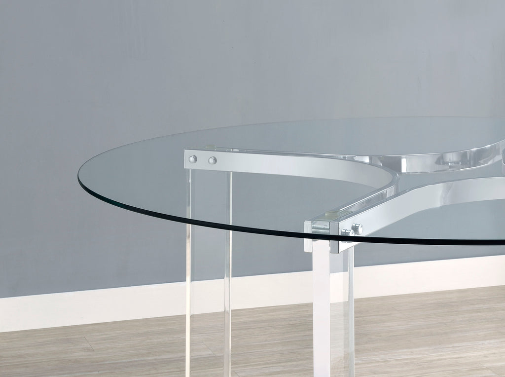 Elevate your dining experience with this chic, contemporary dining set, where modern design meets airy elegance. This set includes a stunning round glass-top table with clear acrylic legs that create a sleek, sculptural profile, complemented by gleaming chrome accents for a touch of sophistication. Four side chairs with clear acrylic seats and backs complete the set, adding a minimalist yet comfortable touch to your space. The sled-inspired chrome bases of the chairs provide stability and a dynamic contrast to the graceful curves of the acrylic, making this set an eye-catching centerpiece for any modern dining room or breakfast nook. Perfectly suited for compact spaces, this set combines style and functionality, offering a light and open feel that effortlessly enhances any decor.