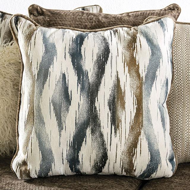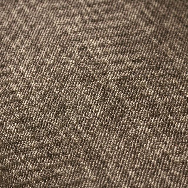 KEMPSTON Sectional, 114"L X 90"W X 38"H, 250lbs. Cozy up in this plush taupe sectional. It features upholstery that is super-soft, genuinely plush thanks to the addition of a superior group of scatter-back pillows. The fabric recalls visual aspects of a variety of wildlife and is pretty wild in itself. The ottoman matches by way of a printed surface, but offers plenty of contrast. Crisp tight welt trim creates a dynamic outline to enhance the design, and tapered wood block feet are stained black for a low key affair.