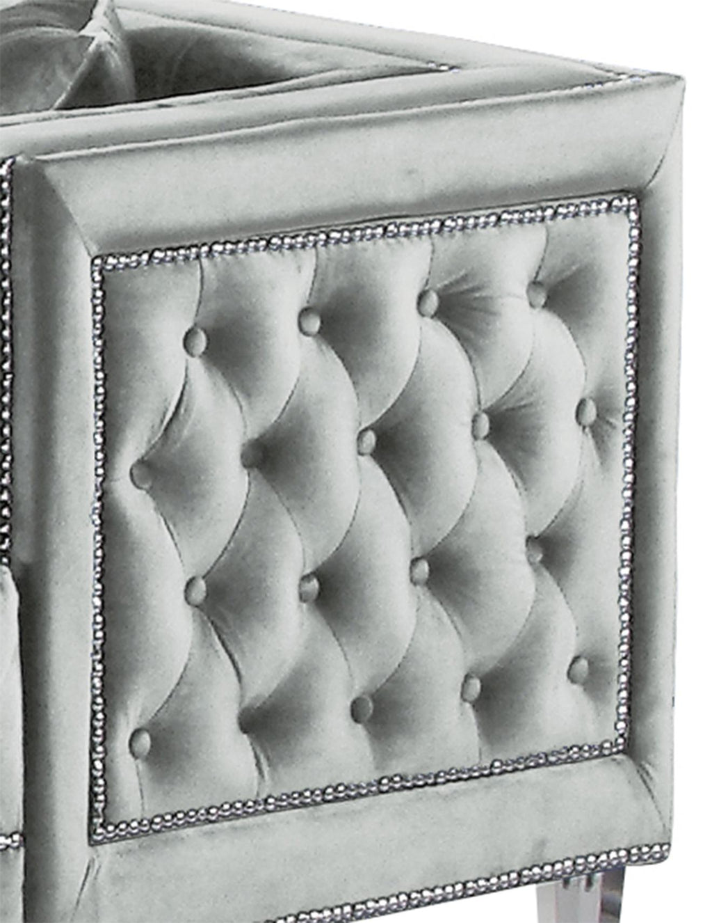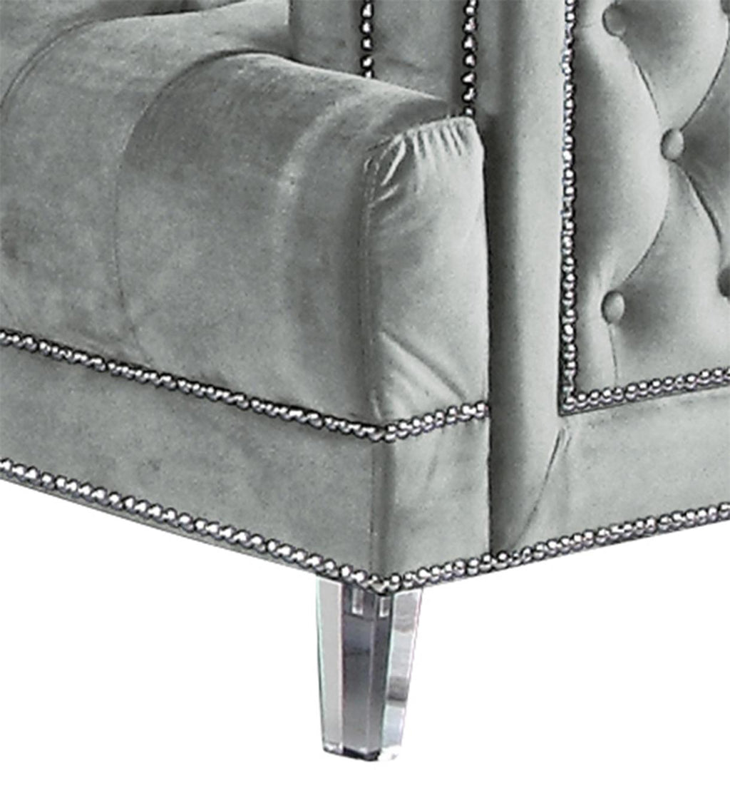 Cosmos Furniture's Kendel Silver modern style silver velvet Loveseat with acrylic legs is elegant and eye catching.� This stunning Kendel Silver Loveseat is the perfect addition to any space.� With track arms this piece boasts clean, straight lines that grab attention. Modern tufted design with a shiny silver velvet cover and chrome nail head trim accents.� Kendel Silver Loveseat sits comfortable and supportive.� Strength and beauty are guaranteed with sturdy wood frame and acrylic legs. This Loveseat is bound to be the conversation piece. Throw pillows are included. Matching pieces are sold separately to complete the set.