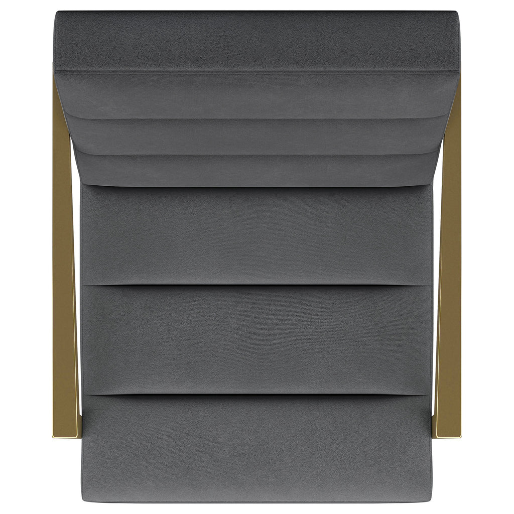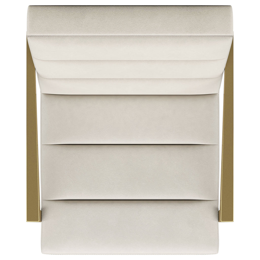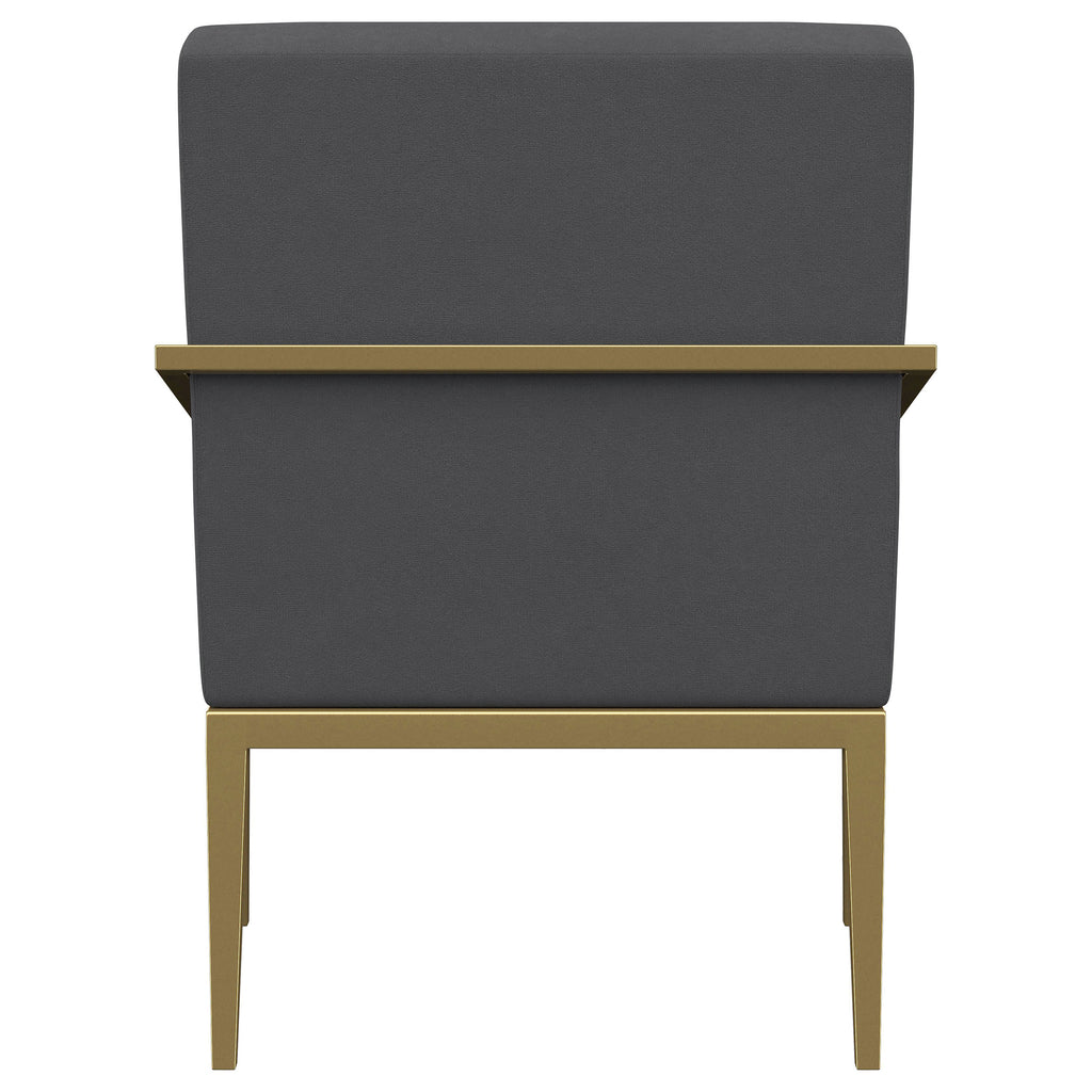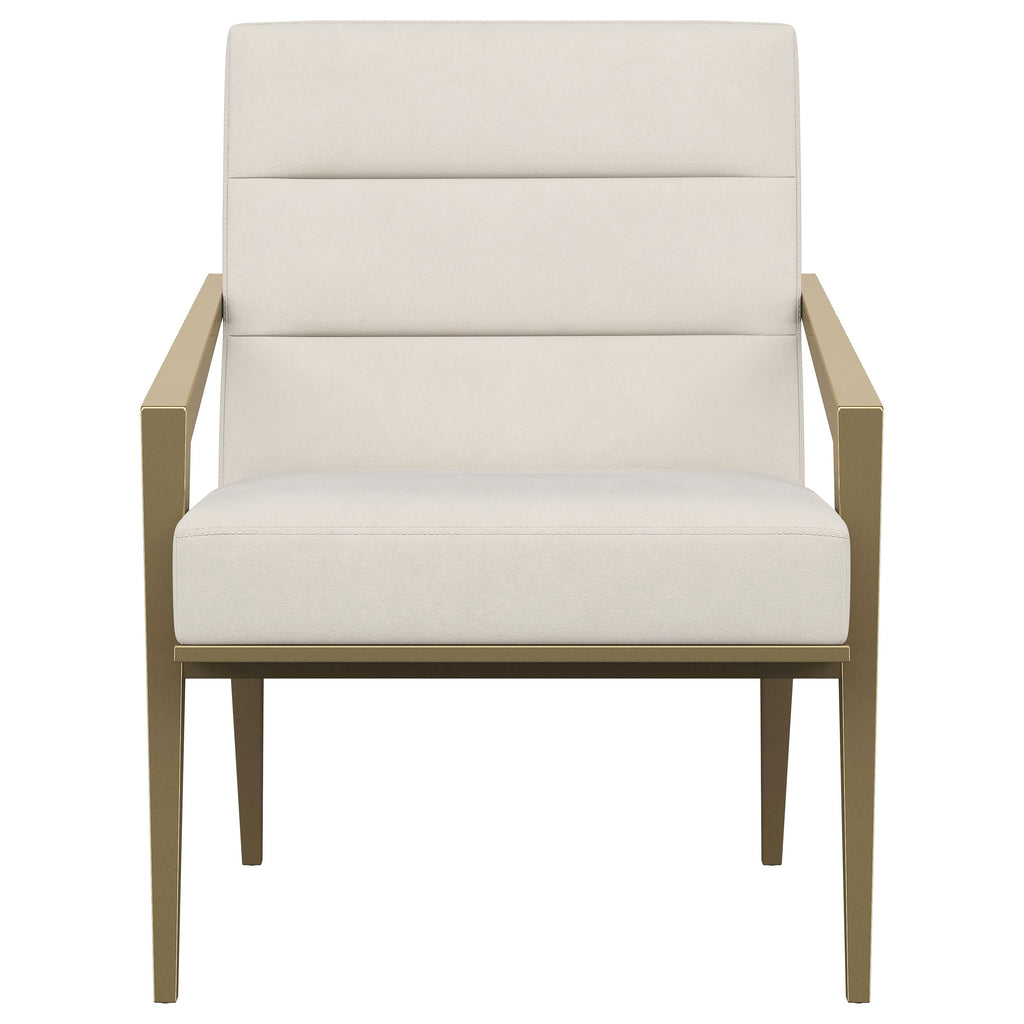 Restrained, modern style meets elegant artistry in a striking contemporary armchair. Designed to stand out, it boasts an upholstered seat and back with a metal frame and arms. The streamlined look receives a gleaming gold finish, adding sophistication anywhere from a sophisticated living room to a refined reception area in a professional space. Sloping, tapered arms define its silhouette, creating an accent chair that's sure to stand out. Channel tufting accents foam cushions, creating a sense of depth and dimension you'll appreciate in any setting. Key Features: • Modern design principles highlight a glam accent armchair that provides stylish comfort • Soft upholstery in a neutral hue creates a chic complement to surrounding decor • Angular frame design is crafted in metal and received a gleaming gold finish • Sloping arms bring sculpted flair to a streamlined silhouette that works virtually anywhere • Seat and back and channel tufted to create a sense of structure and offer additional support