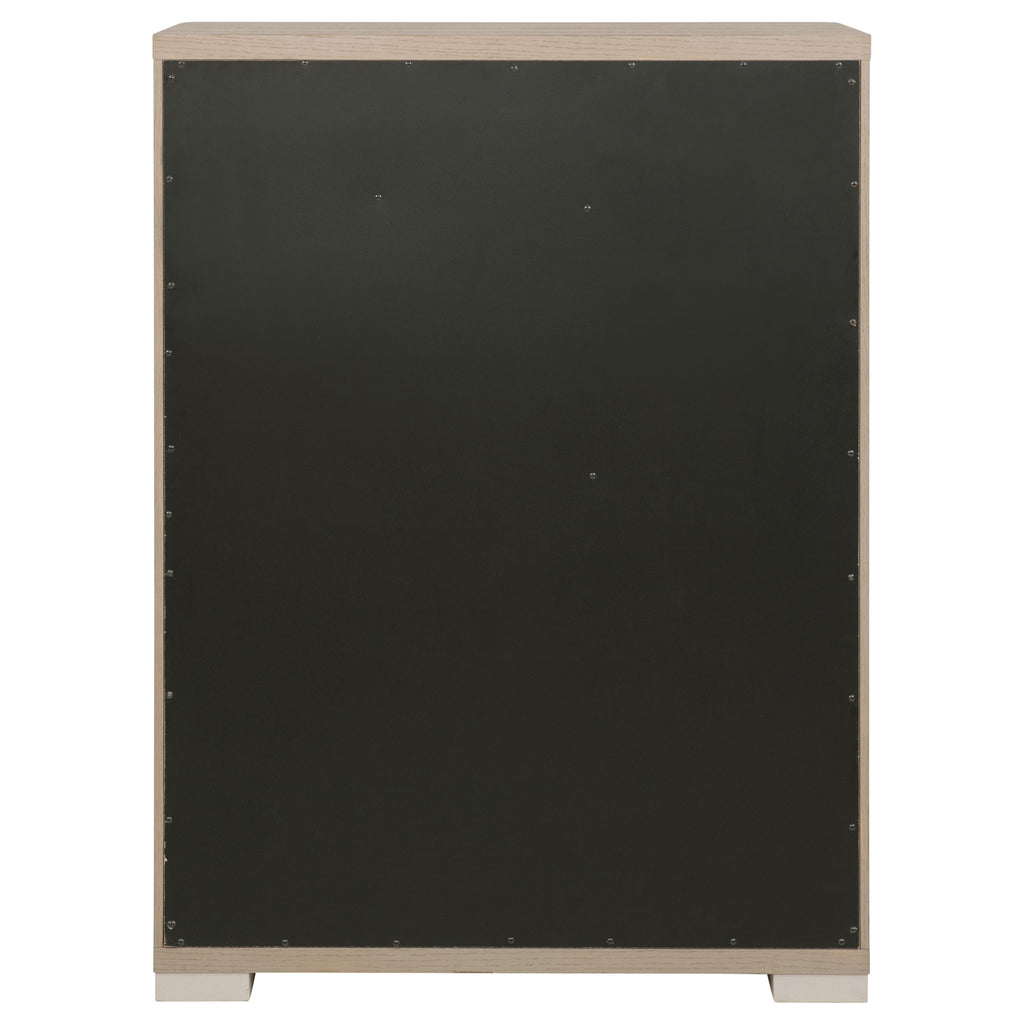 This five-drawer chest offers a balance of style and storage with its light elm finish and brushed nickel fingertip pulls. Rounded corners enhance its sleek design, while extra-large tinted drawers provide ample storage. Built with French dovetail fronts, English dovetail backs, and smooth metal glides, this chest is as durable as it is elegant, making it ideal for compact and modern bedrooms.