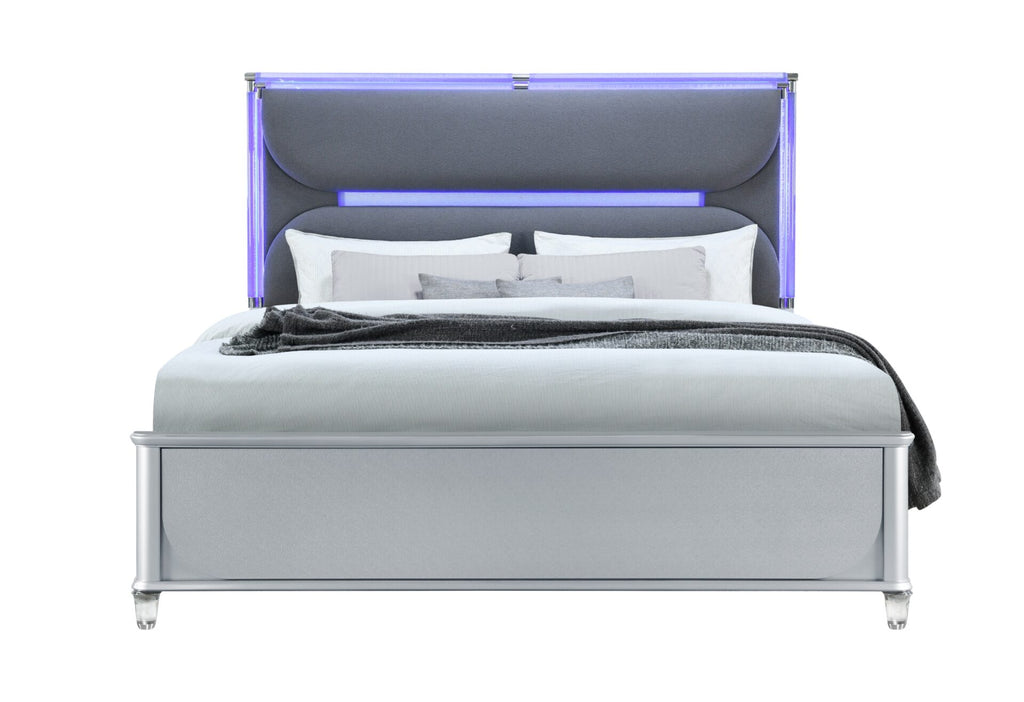 The Lando Bed is the highlight of the collection, featuring an upholstered headboard with acrylic trim and integrated LED accents. Finished in sophisticated grey with acrylic details, this bed combines modern design with luxurious comfort, creating a stunning focal point for your bedroom.