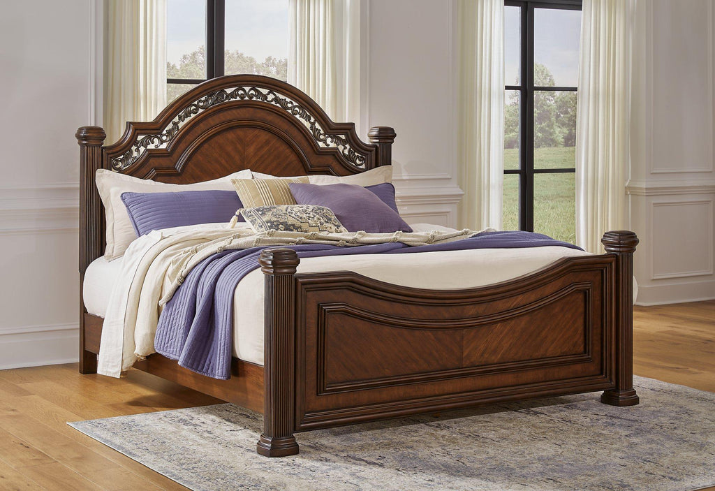 Take inspiration from the traditional luxury of this California king poster bed. Classic with a rich cherry brown finish, its stately presence graces your room with an air of opulence. Your taste for exquisite details is satisfied with the headboard’s ornate accent filigree. With an elegantly crafted footboard completing the look, your restful retreat has never been so refined.