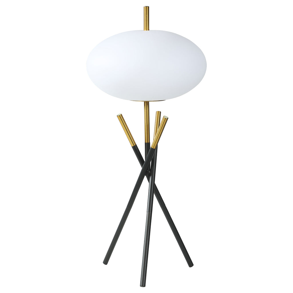 This table lamp offers a striking modern design with its unique tripod base and frosted globe-shaped shade. Crafted with a combination of sleek black and gold metal finishes, the lamp exudes elegance and contemporary charm. The frosted plastic shade provides soft, diffused lighting, making it suitable for a variety of settings. Sturdy and functional, this lamp is an ideal addition for those seeking a blend of aesthetic appeal and reliable illumination.
