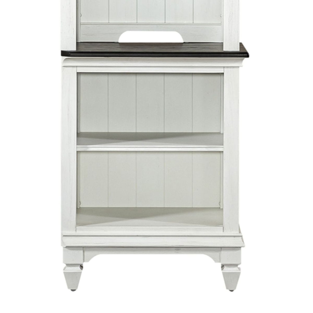 Liberty Allyson Park Right Pier Base in Wirebrushed White 417-ER00B. Maximize storage and convenience with the Allyson Park right pier base. Crafted with pine solids and veneers, this piece features a wire brushed white finish with charcoal tops, bead molding, a planked back panel, and fixed shelving anchored by square tapered legs. Pair with the left pier top, right pier unit, entertainment hutch and 72" entertainment stand to complete the set, as this piece cannot stand alone.
