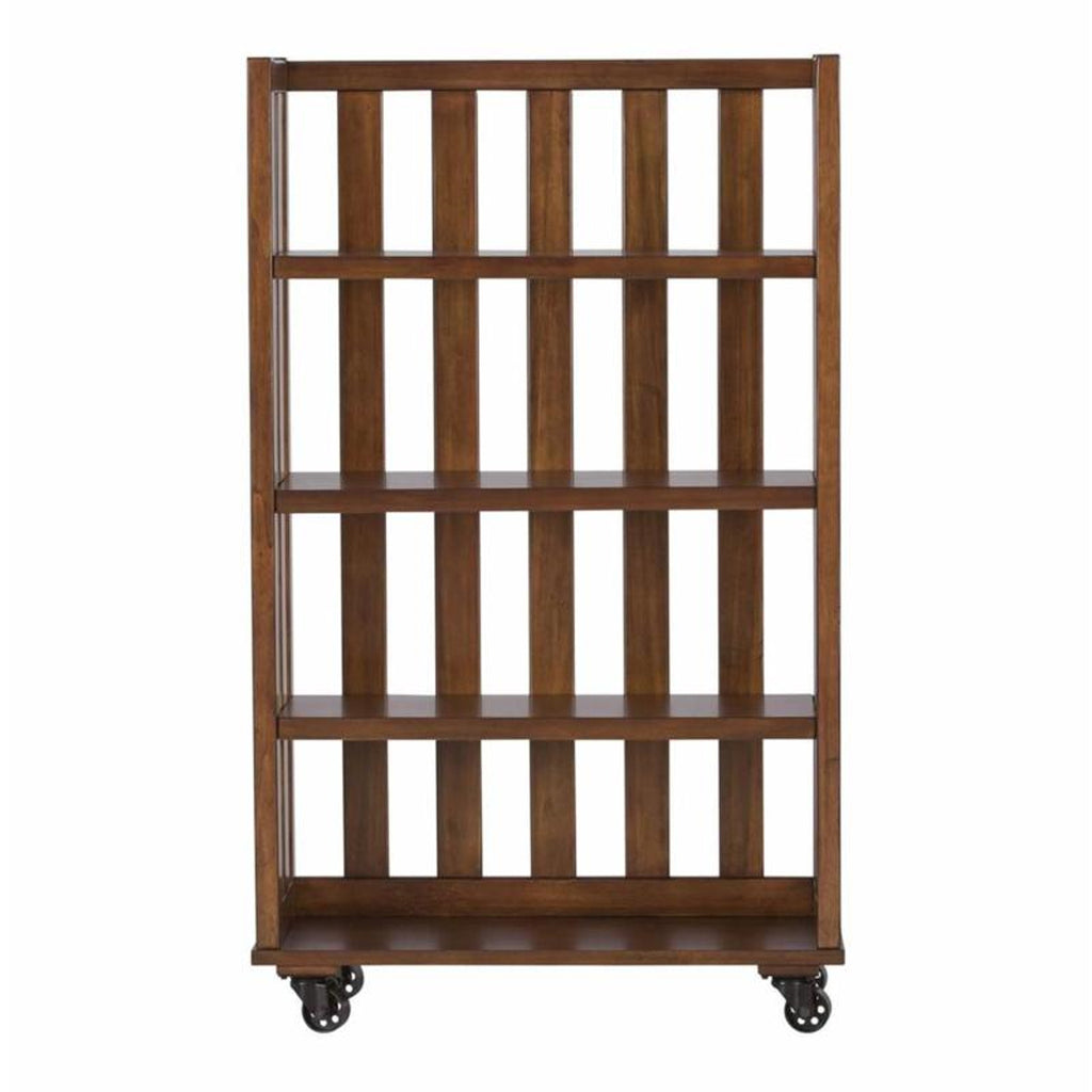 Liberty Arlington House Open Bookcase in Cobblestone Brown 411-HO201. The Arlington House Collection by Liberty Furniture is made of Poplar Solids with Acacia Veneers in Cobblestone Brown Finish. This collection offers industrial style throughout the pieces including: Metal Tube Framing, Industrial Casters, and Antique Pewter Cup Hardware. The desk has metal base and Flip Down Keyboard Tray, while the Fully Finished Credenza is provided with Pull Out Printer Shelf and storage drawers. Framed Drawer Fronts on Cases bring visual interest, while Full Extension Metal Side Drawer Glides ensure ease of use.