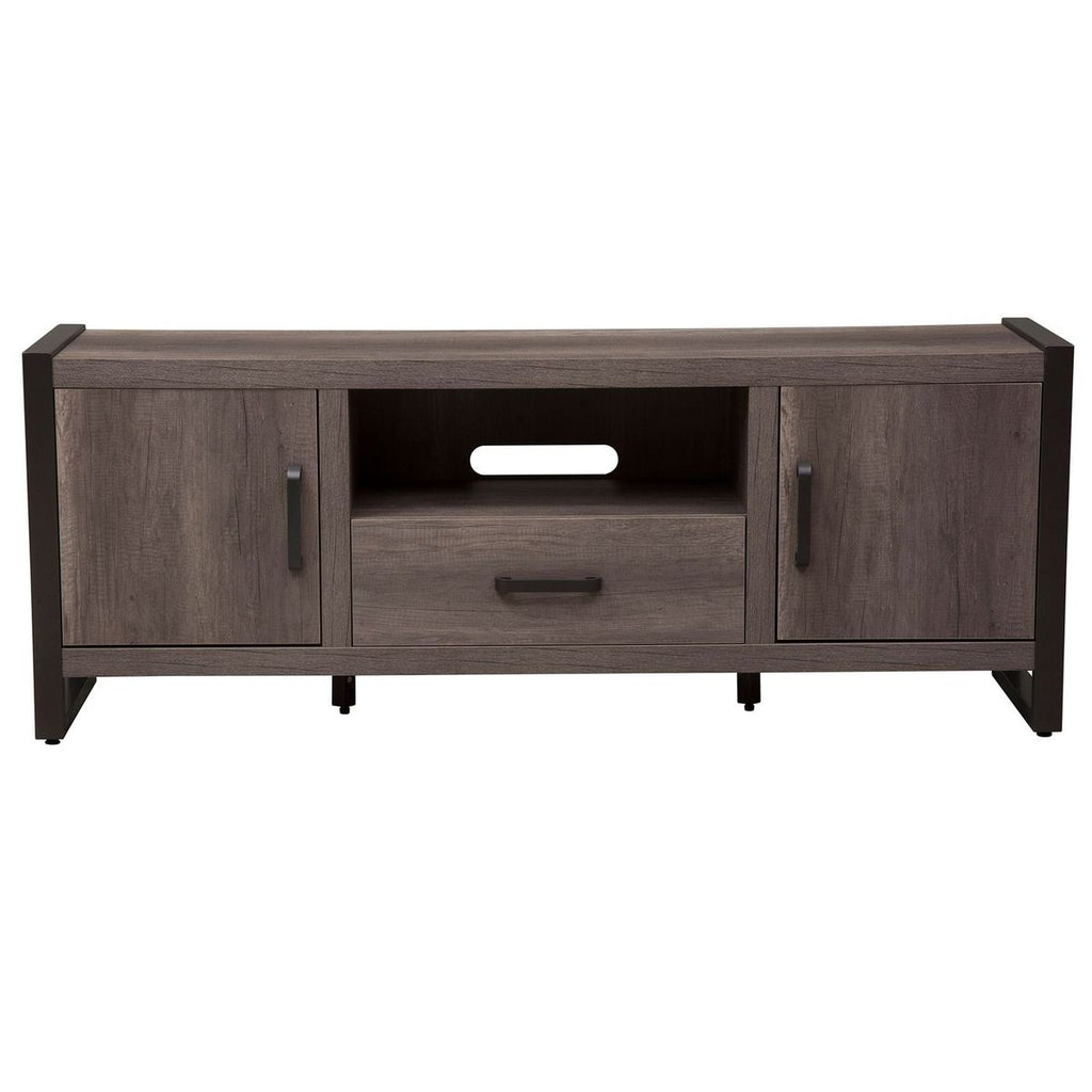 Liberty Farmhouse Tanners Creek Entertainment TV Stand in Greystone 686-TV63. Tanners Creek Entertainment 63" tv stand is sure to bring the whole family together. This entertainment center is scratch resistant, thanks to the use of melamine. The console can accommodate most 70" TVs and features European hinges for a soft close, an open compartment for components and a center drawers that is flanked by two doors, accented with dark pewter faux metal hardware. Pair with the piers to complete the set.