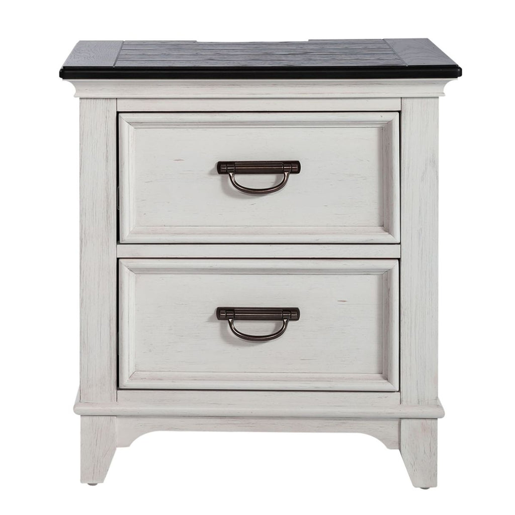 Liberty Furniture Allyson Park 2 Drawer Nightstand with Charging Station in White 417-BR60. Create a classic look with a casual feel using this 2 drawer night stand. The two-toned wire brushed white finish with charcoal tops creates a cottage style that works anywhere from the beach to the mountains. Crafted of poplar and rubberwood solids with cathedral white oak tops, this piece features fully stained interior drawers, full extension drawer glides for easy access to storage, and bottom case dust proofing to preserve contents. Planked tops add a vintage vibe while the stylish tapered feet tie in to the cottage design. With today's technology in mind, users can enjoy the benefit of the incorporated charging station, featuring two USB ports and two outlets, making multi-device charging a breeze.