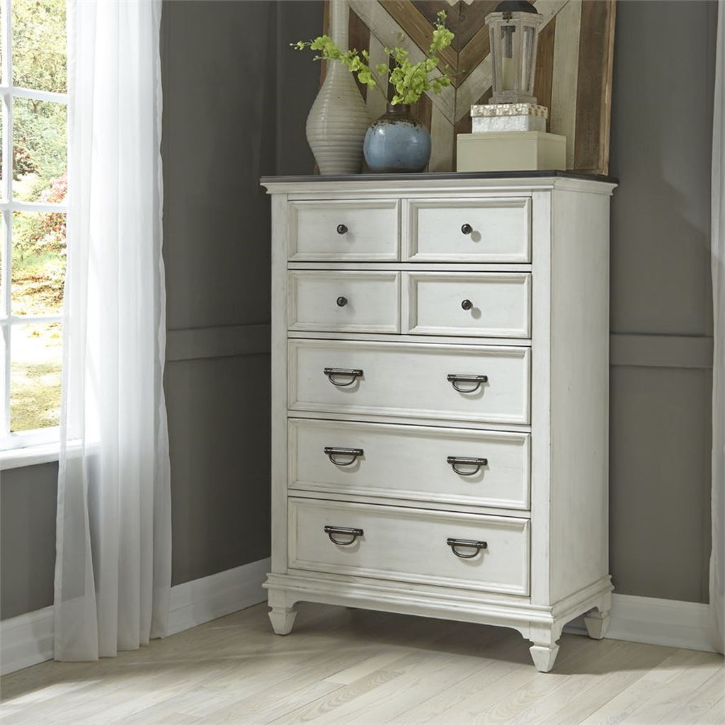 Liberty Furniture Allyson Park Drawer Chest in Wirebrushed White 417-BR41. Cottage styling with a heavily distressed finish that will work from the beach to the mountains to an industrial loft.