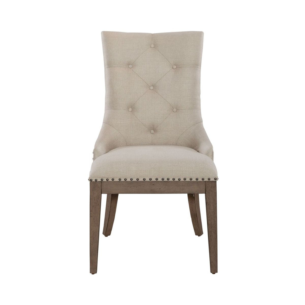 Liberty Furniture Americana Farmhouse Uph Shelter Side Chair (Set of 2) in Dusty Taupe & Black 615-C6501S. Reinvent your style and comfort with the Americana shelter side chair, prefect for any room in the house. Features exposed frame to giving you that deconstructed element, tufted back in a truffle linen fabric, nail head accents, web seating and tapered.