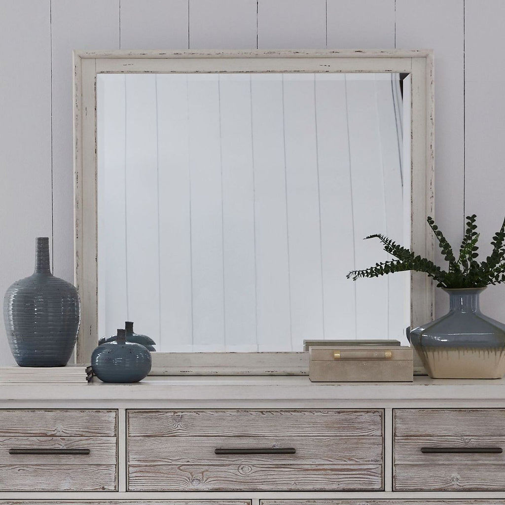 Liberty Furniture Backroads Landscape Mirror in Weathered White/Parchment Brown 142-BR51. Enhance your bedroom's charm with the exquisite Backroads landscape mirror. Crafted with excellence using Poplar solids, this mirror features a Weathered White finish. The mirror frame boasts softly rounded bead molding, delicately outlining the reflective surface with a subtle yet stylish detail. A 1-inch beveled edge around the mirror not only adds a refined finishing touch but also enhances its visual appeal by creating depth and dimension. Attach the mirror to the Backroads 7 drawer dresser with the included bolt on supports. The Backroads landscape mirror promises both style and durability, making it the perfect addition to your bedroom ensemble.