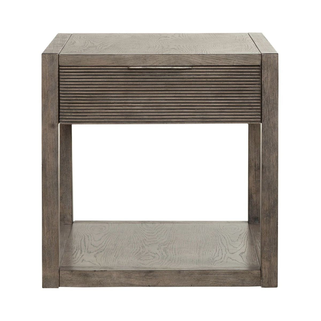 Liberty Furniture Bartlett Field End Table in Dusty Taupe 798-OT1020. Furnish your home, furnish your life with the Bartlett Field end table. Crafted with excellence using rubberwood solids with split heart white oak veneers, this end table features a Dusty Taupe finish. The end table has one full extension drawer with a reeded textured drawer front that is accented with a custom Antique Pewter finger pull hardware. The bottom shelf is great for extra storage or display items. Square block legs along with clean lines add for a contemporary feel. Convey energy and imagination with the Bartlett Field end table.