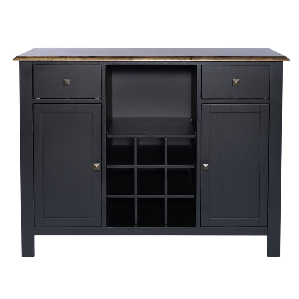 Liberty Furniture Carolina Crossing Server in White 186W-SR4836. Enhance your space with the Carolina Crossing server in white. Crafted of rubberwood solids, this piece features a two-toned white and honey finish, bottom case dust proofing, two fully stained interior drawers, removeable nine bottle wine storage, two wood framed doors with an adjustable shelf behind each, and is accented by antique brass square knob hardware. This server is available in multiple finishes and the heavy distressing translates well into any decor.