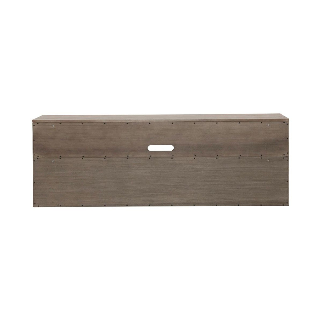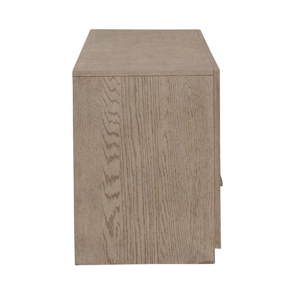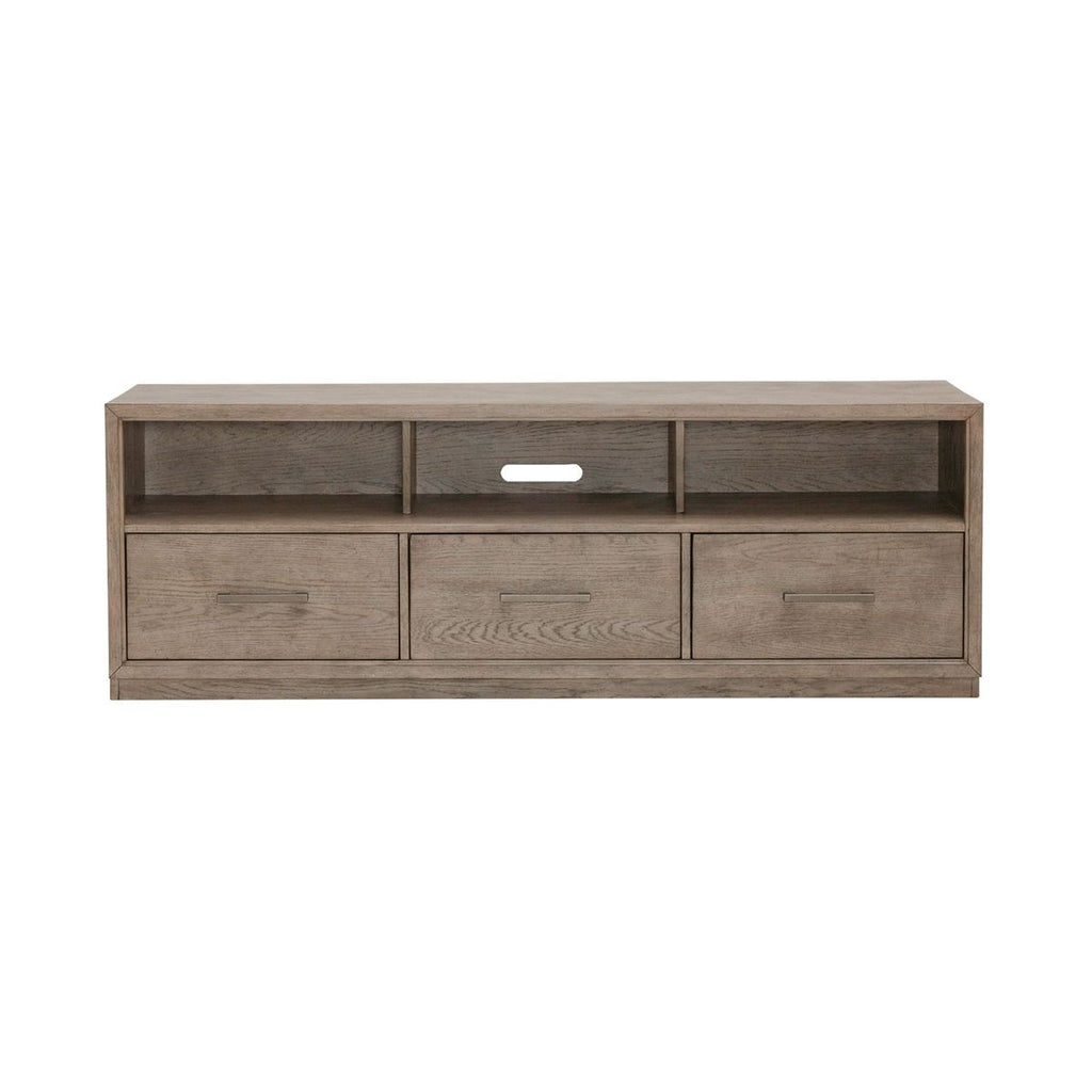 Liberty Furniture City Scape Entertainment TV Console in Burnished Beige 421-TV70. Make your home impressive with the City Scape entertainment TV console. Crafted with excellence using rubberwood solids and split heart white oak veneers, this piece features a Wire-Brushed Burnished Beige finish. Three full extension drawers stretch across the bottom of the TV console, each with an open storage cubby directly above for plenty of storage. The drawers are accented with a Brushed Brass bar pull hardware. The plinth base gives a contemporary feel. Convey energy and imagination with the City Scape entertainment TV console.