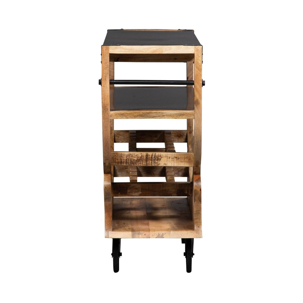 Liberty Furniture Danley Accent Bar Trolley in Weathered Brown 2052-AT4739. Danley accent bar trolley offers function with beauty. Crafted of solid rough cut mango with a powder coated metal top and middle shelf for years of durability. Features a stemware rack, 10 bottle wine storage and industrial iron wheels. Easy move ability to any room for a party.