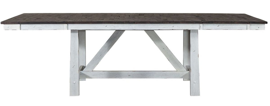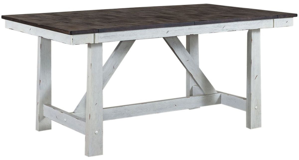 Liberty Furniture Farmhouse Trestle Table in White 139WH-T4002. Gather the whole family with the Farmhouse trestle table. Crafted of rubberwood solids and veneers, this piece features a timeless heavy distressing, two removeable 18" leaves to comfortably seat up to eight, an "X" style trestle base, and a solid wood top. The two-tone white finish with wood tone tops creates a versatile look that is sure to be the perfect addition to any space.