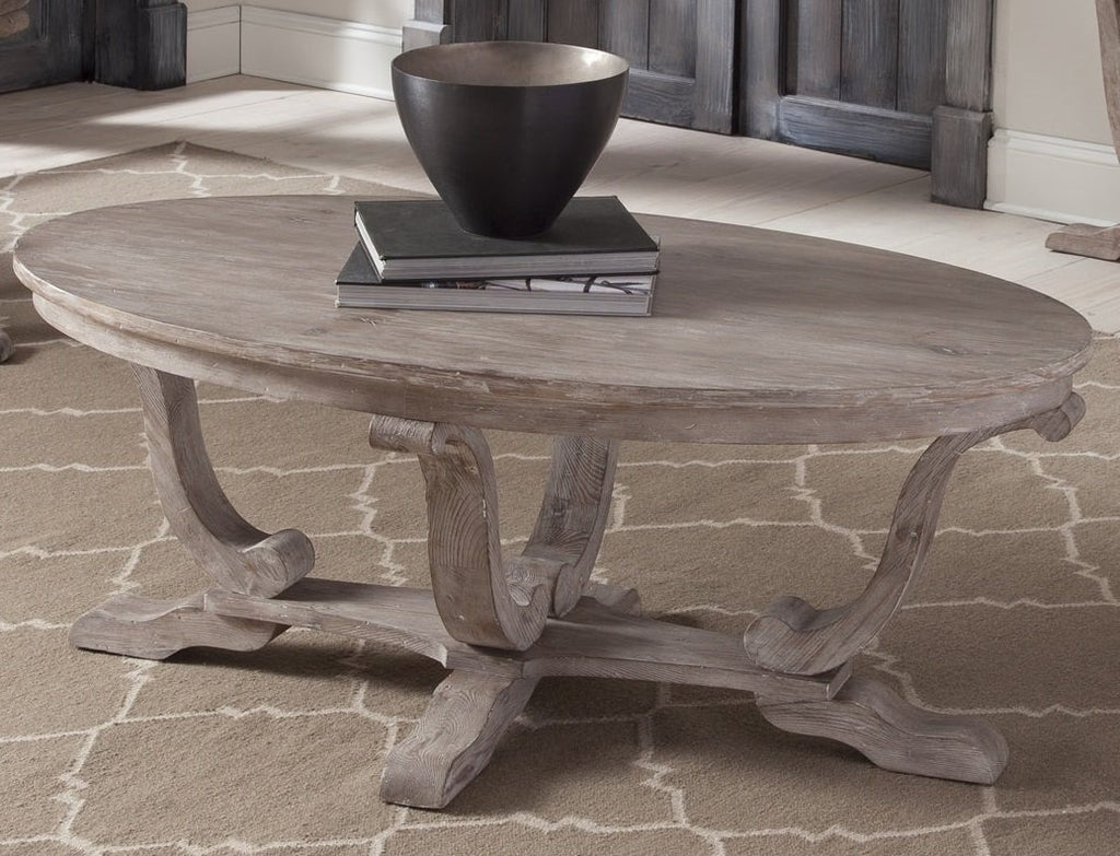 Liberty Furniture Greystone Mill Oval Cocktail Table in Stone White 154-OT1010. Liberty Furniture is a dedicated provider of all wood products including bedroom, dining, entertainment, occasional and home office categories. Our products are developed using years of knowledge coupled with a vision of the future. By working with industry leading designers and top tier factories, Liberty is well positioned to provide quality products at a great value. We use high-quality wood with the best veneers and conduct an extensive, detail-oriented finishing process, including some level of distressing. In addition, we build our products with high-level hardware to ensure durability. Salvaged stone white wash finish, Greystone Mill Occasional Table Collection with wire brushing creates a casual, refined appeal when combined with a traditional silhouette. Oval shaped cocktail features cabriole legs with a flat pedestal base. Perfect pieces for your living room that lasts for life.